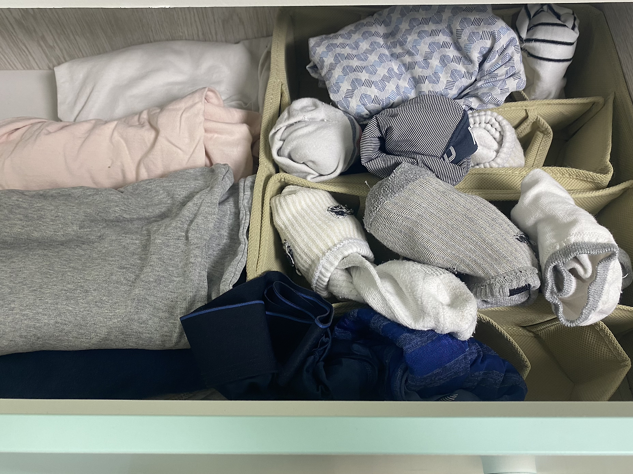 정리하면서 오래된 속옷과 양말을 비웠더니 공간이 넓어져서 사용이 더 편리해졌다. 칸막이에 하나하나 넣는 수고 없이 그냥 아무렇게나 넣어도 공간이 분리되어 있어서 정리되어 보인다.
