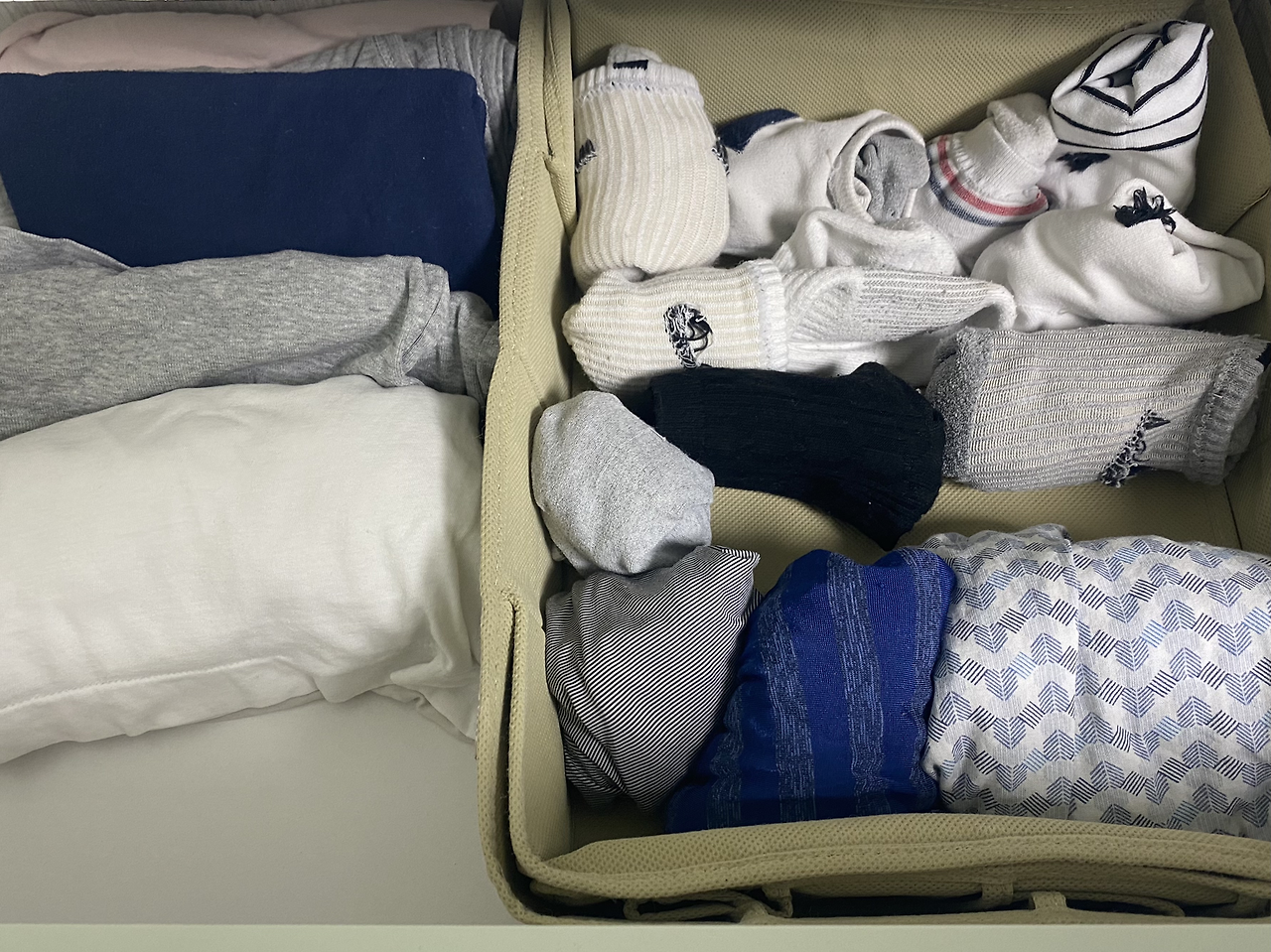 양말, 속옷 정리를 위해서 수납함을 구입했었는데 정리유전자가 없는 우리 부부에게는 칸막이마다 하나하나 넣어 사용하는 게 힘들었다. 그러다 보니 칸막이 위로 그냥 막 넣어 사용하게 되고 더 엉망이 되었다. 그래서 그냥 큰 공간박스를 사서 속옷과 양말을 넣어두면 좋을 것 같다는 생각에 또 수납함을 검색하려다가 기존에 있는 것을 그냥 활용하고자 속옷 정리함의 칸막이를 다 접어 넣어서 사용하고 있다.
