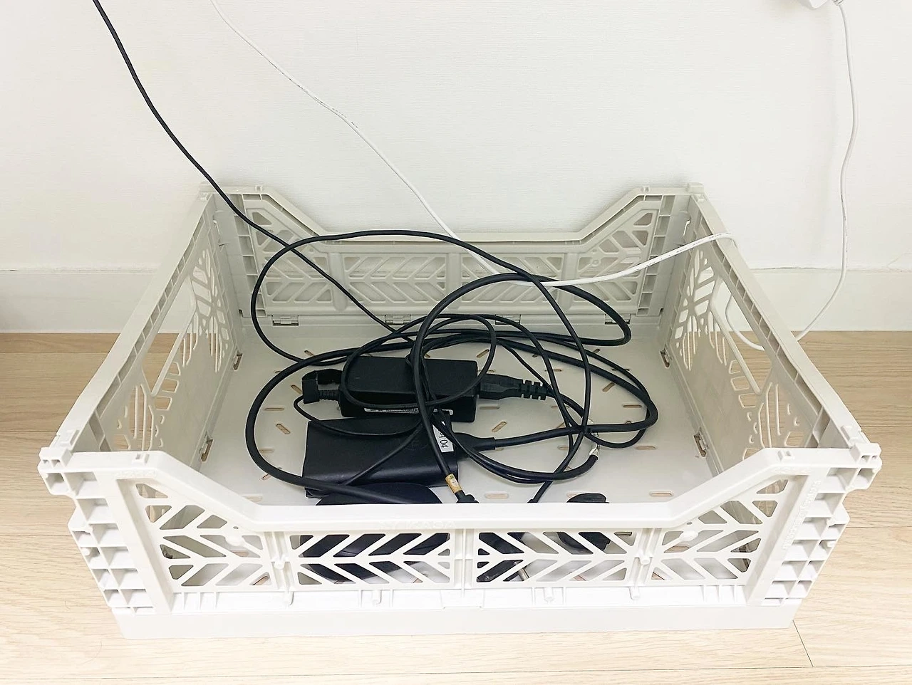 책상 아래 충전기, 전선 등으로 어질러진 공간은 공간박스로 지저분해져도 되는 공간을 설정해둔다. 차곡차곡 전선을 정리해서 깔끔하게 쓰는 사람에게는 지저분한 정리법이겠지만 '정리유전자가 없는 사람'에게는 이것도 정돈하는 것이다.