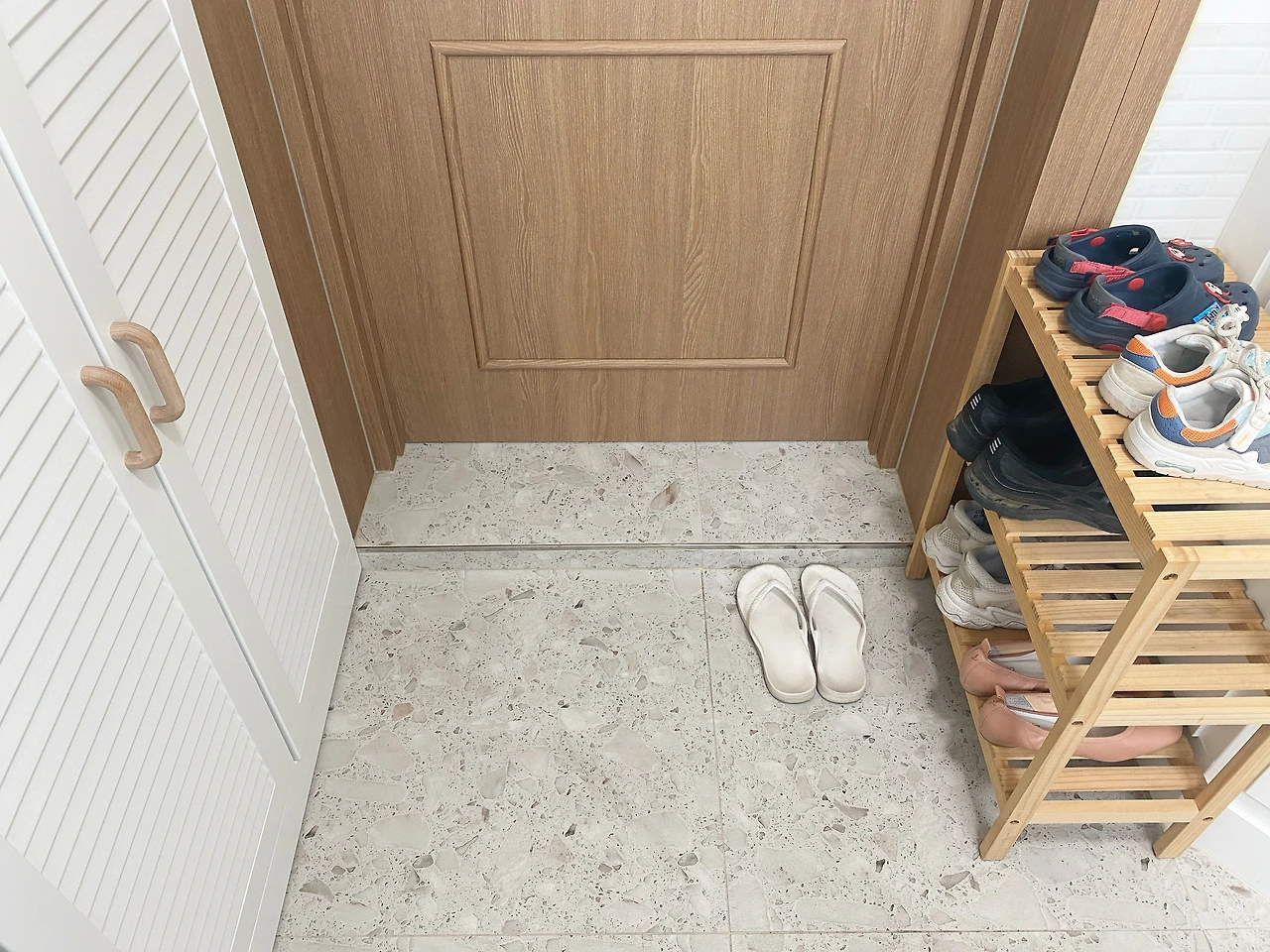 그래서 나는 신발 선반을 현관 입구에 따로 두었다. 하루 종일 신어서 습기 찬 신발을 바로 신발장에 넣는 건 위생상으로도 좋지 않으므로 신발의 습기도 빼주고 정리도 해줄 겸 신발장 바깥에 신발을 쉽게 넣는 공간을 두니 신고 벗기도 편리하고 현관도 정리된듯한 인상을 주어 깔끔해 보인다. 하지만 너무 많은 신발이 다 꺼내지지 않도록 일주일에 한 번 정도는 자주 신지 않는 신발을 신발장 안으로 넣어둔다.