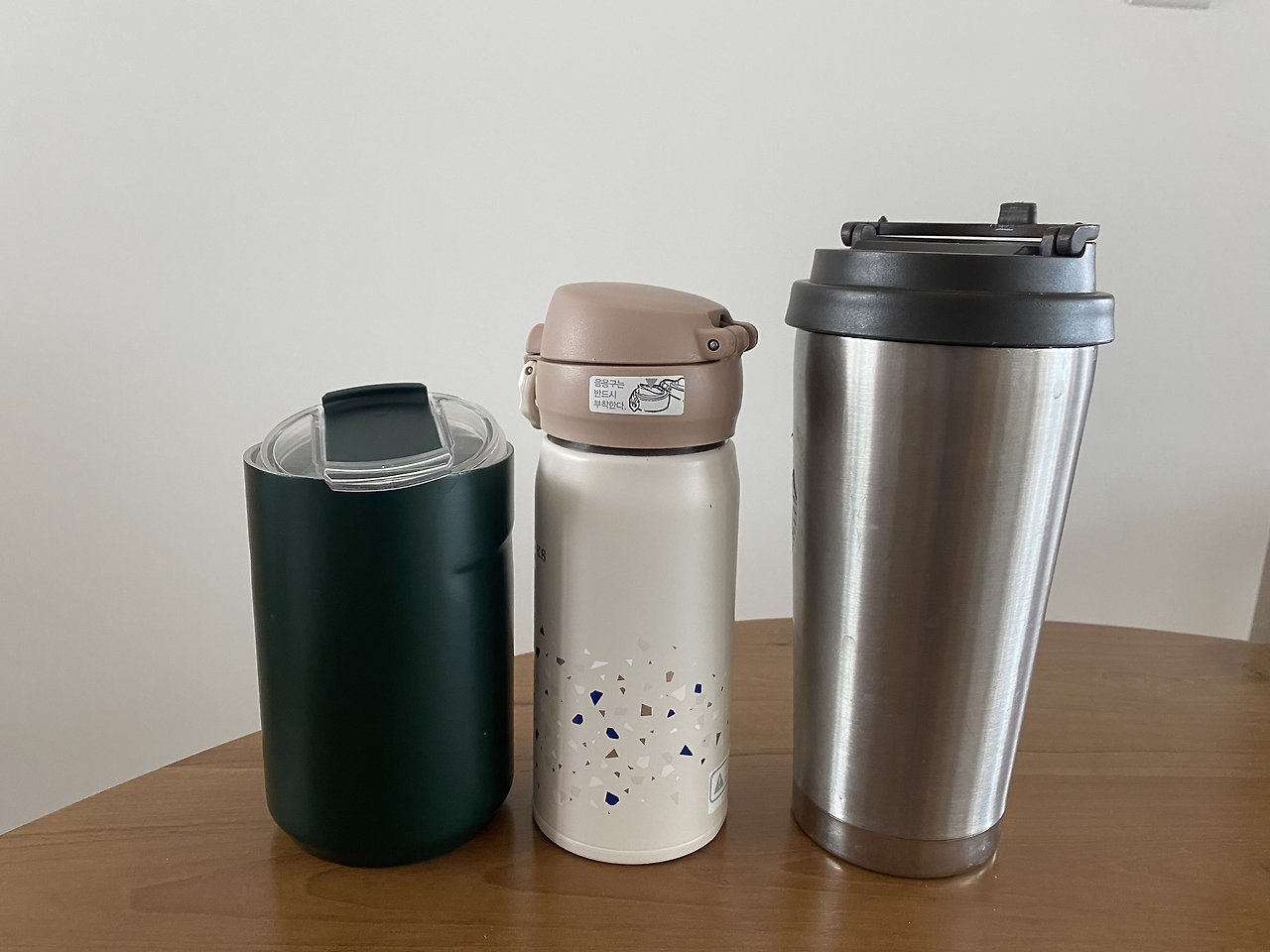 왼쪽 컵은 집에서 보온 목적으로 자주 쓰는 보온컵이다. 카페에 가서 음료를 마시는 경우에도 자주 들고 다닌다. 입구가 넓어 세척이 쉽고 보온 효과도 뛰어나다. 중간의 텀블러는 야외 나들이용으로 자주 쓰는 텀블러이다. 하루 종일 얼음이 녹지 않을 정도로 보온 효과가 좋아서 수년째 아주 잘 쓰고 있다. 오른쪽 텀블러 컵은 아이스음료를 마실 때 집에서도 자주 쓰는 스테인리스 텀블러이다. 역시 입구가 넓어 세척이 편리하다. 세척이 편하지 않으면 자주 사용하기가 힘들기 때문에 가능한 세척이 편리한 제품을 고른다. 세척이 편하니 자주 손이 가고 나도 모르게 환경보호에 약간은 도움을 주게 된다.