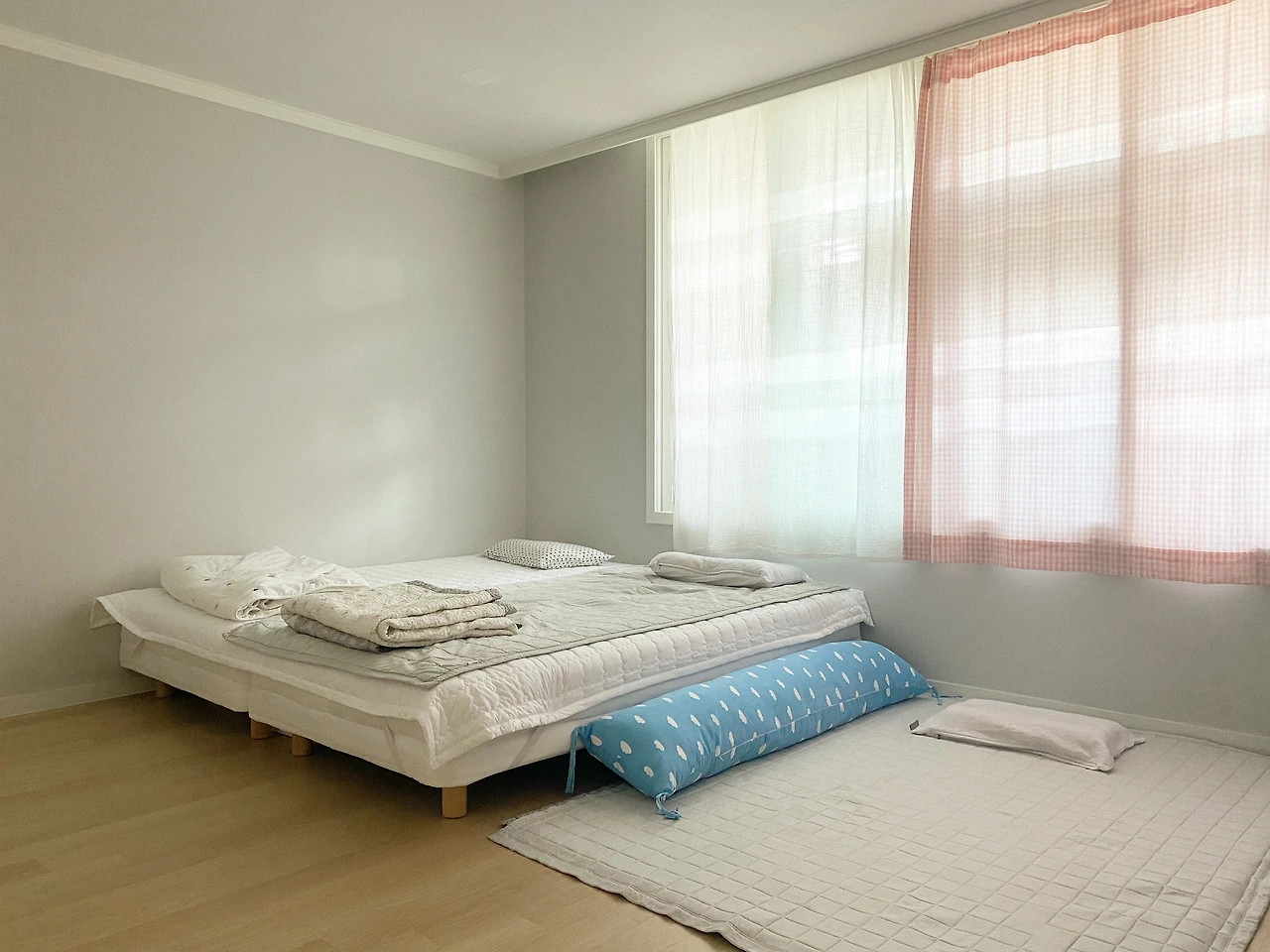 차가운 겨울의 공기를 피해 창문에서 떨어진 곳에 뒀던 침대들은 살랑살랑 여름 바람을 느끼기 좋은 창가로 옮겨준다. 시원한 소재의 이불로 바꿔주고 지난 이불은 세탁 후 햇살 좋은 날 뜨거운 볕에 말려 이불장에 넣어 보관한다. 자면서 땀을 많이 흘린 날에는 아침에 이불을 세탁해서 널어두면 저녁이면 바짝 마른다. 그래서 여름엔 굳이 침구가 여러 개가 있을 필요가 없다. 게다나 나와 아이는 여름에는 이불을 덮지도 않고 자므로 이불도 한두 개만 있으면 적당하다. 여름이 되면 더욱 미니멀해지는 우리집 안방. 하지만 열이 많은 우리 아이는 여름엔 늘 바닥에서 자기 때문에 바닥에 이불이 깔려있을 때가 많아 지저분해 보인다. 바닥에 깔린 이불을 관리하는 건 역시 쉽지 않다. 아침에 일어나서 등원 준비하다 보면 이불 정리하는 걸 깜빡하기 일쑤이기 때문이다. 그러다 보면 일어난 자리 그대로 잠들게 되는 날도 많다. 그래서 자기 직전에라도 한번 털어줄 수 있게 바닥에는 최소한의 침구만 둔다.