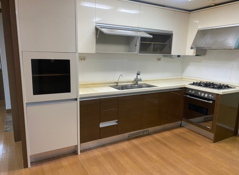 그런 생각을 했던 이유는, 이사 갈 집은 구축 아파트여서 주방에 보조 주방이 있었기 때문이다. 그 보조 주방을 메인 주방으로 쓰고, 집 안의 주방 공간은 텅 빈 공간으로 만들고 싶었다. 건축이고 뭐고 아무것도 몰랐던 내 생각은 그랬다. '집 안'에 주방을 두지 않고 베란다로 나가야 주방이 있으면 더 좋을 것 같다고 생각했는데, 모든 것을 철거해보니 그건 불가능했다. 주방엔 수도 시설이 있었고, 환풍구가 있었다. 죽을 때까지 이 집에서 살게 아니라면 '다음에 이사 오는 사람'의 입장도 고려를 해야 했다. 주방 싱크대를 설치하시는 분과 논의를 한 끝에 최소한의 크기로 주방을 제작하기로 했다. 줄일 수 있는 한 최대한 줄여서 만든 주방!