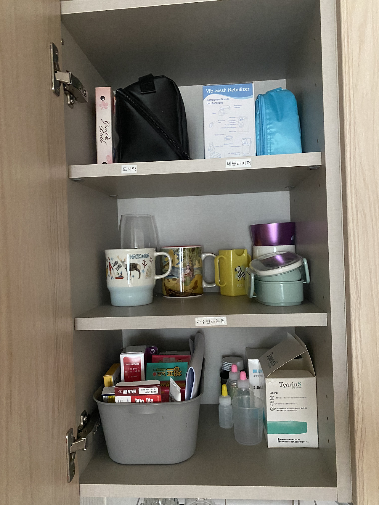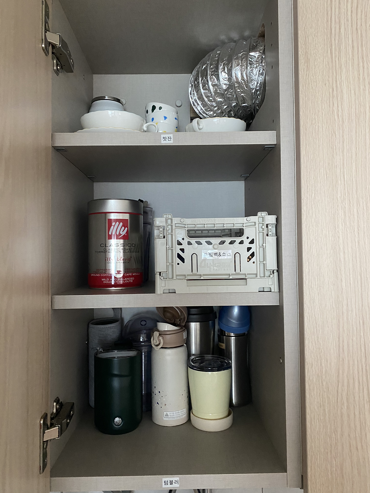상부장엔 상비약과 텀블러, 도시락, 컵, 커피와 차 등을 보관하는 공간으로 잘 사용 중이다. 상부장이 없었으면 없는 대로 또 다른 곳에 보관했겠지만 있고 보니 안 그래도 수납공간이 없는 우리 집엔 꼭 필요한 공간이 되었다.