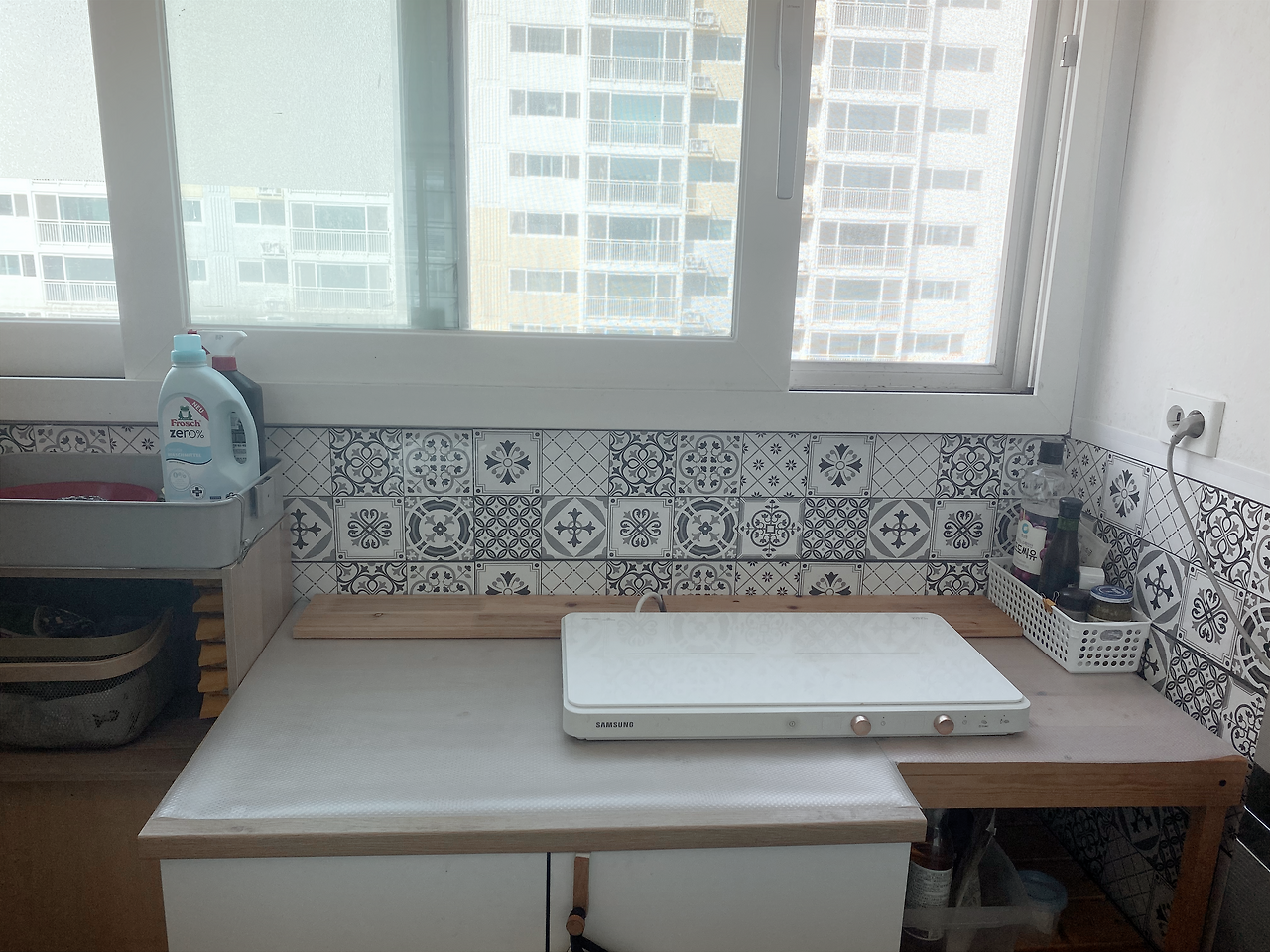 인테리어를 전혀 하지 않고 그대로 사용 중이라 예쁜 공간은 아니지만 아주 실용적인 공간이다. 이사하기 전 이 집의 보조주방을 보자마자 여기를 주방으로 써야겠다고 결정했다. 하지만 집의 구조상 보조주방에 세탁기를 둬야만 해서 보조주방을 생각보다 좁게 쓰게 되었다. 그래도 요리를 하는데 불편함이 없어서 아직까지 만족하고 사용 중이다. 이케아에서 구입한 작은 조리대는 인덕션과 오븐을 두기에 안성맞춤이다. 이 작은 조리대의 아랫칸에는 오븐을 두고, 위칸에는 냄비와 프라이팬 등을 수납한다.