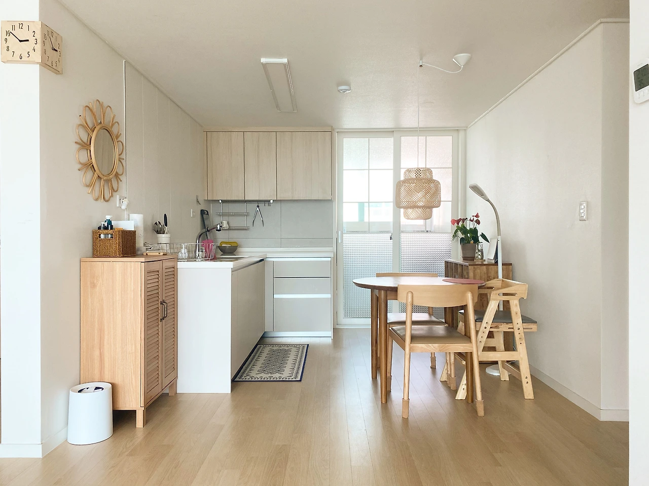 극단적으로 미니멀한 주방을 꿈꿨지만, 아이도 있는 집인지라 최소한의 필요한 것들은 있어야 했다. 주방이 좁아서 좋은 점은 나머지 공간을 다양하게 배치하고 활용할 수 있다는 점이다. 싱크대를 축소하니 식탁을 두는 공간이 넓어져서 6인 식탁도 충분히 들어갔다. 주방은 작은 주방을 원했지만 식탁은 커다란 식탁을 원했던지라 세 식 구이지만 6인 식탁을 샀었다. (식탁에 대한 이야기는 다음에 다루도록 하겠다.)