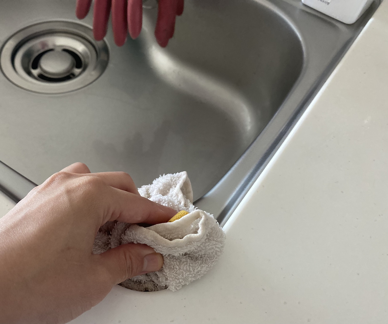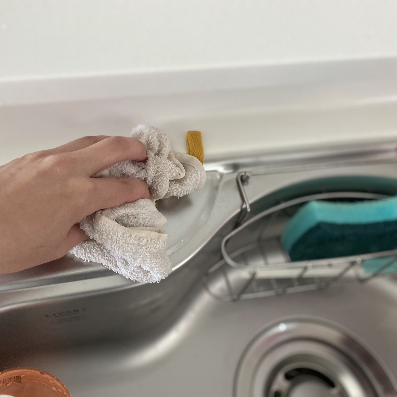 주방 싱크대 관리에서 가장 중요한 건 '건조'이다. 싱크볼을 제대로 닦지 않고 물기가 흥건한 채로 두면 물때가 생겨서 위생상 좋지 않다. 설거지 후엔 항상 이렇게 닦아서 마무리를 해야 한다.