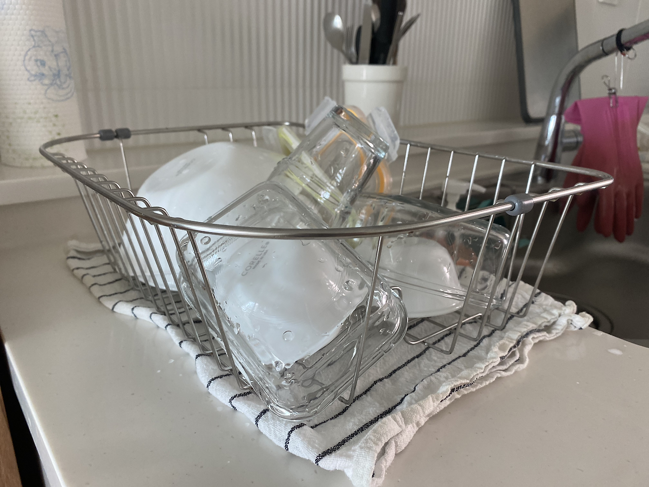 식기 건조대는 항상 위로 꺼내서 사용한다. 그래야 건조가 더 빠르기 때문이다. 설거지할 때 식기 건조대 아래로 떨어지는 물기는 주방 행주를 깔아서 해결한다. 이렇게 하면 깔끔하게 싱크대를 관리할 수 있다. 그리고 설거지 후 다 젖은 행주는 꼭 건조해준다.