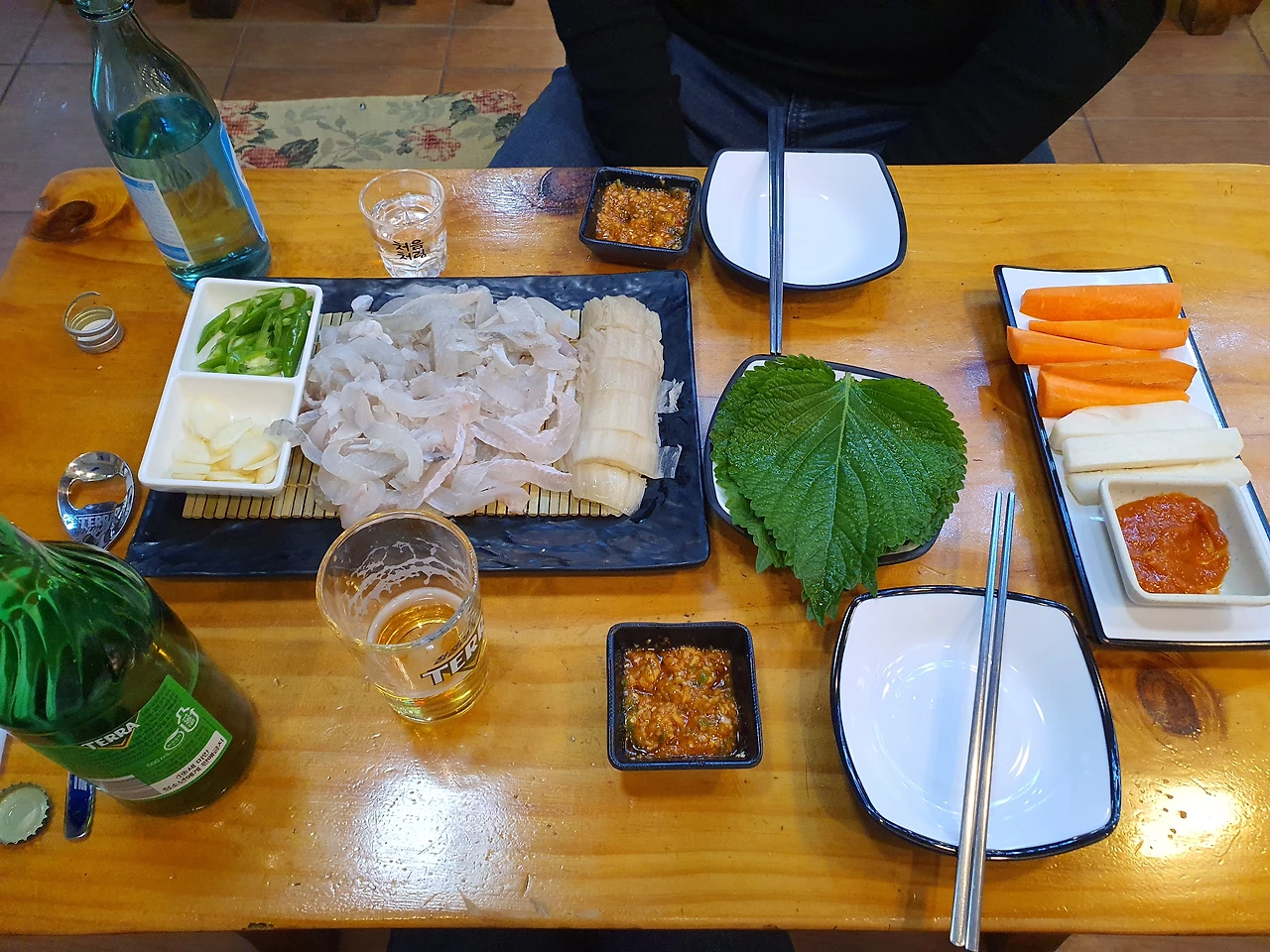 오늘의 메뉴는 세꼬시. 주종은 소주와 맥주.