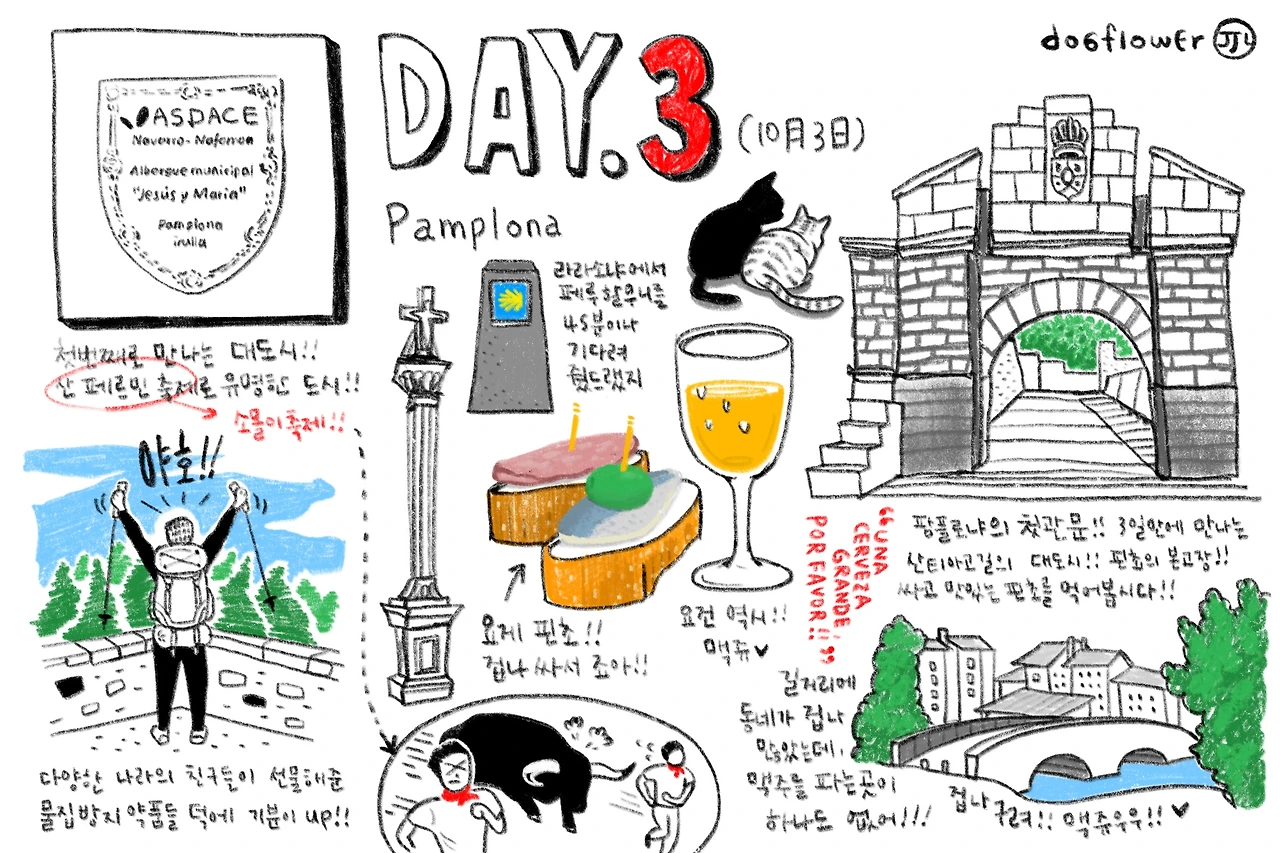 2-1.산티아고 길의 첫 번째 대도시.2-2.타파스의 일종인 핀쵸의 발상지.2-3.소를 피해 무작정 달리는 산 페르민 축제의 고장.