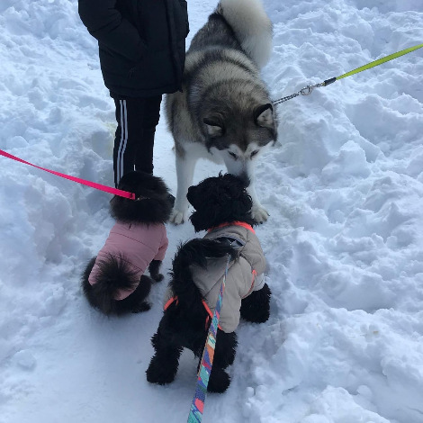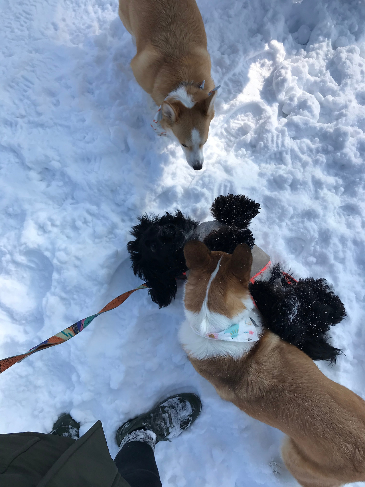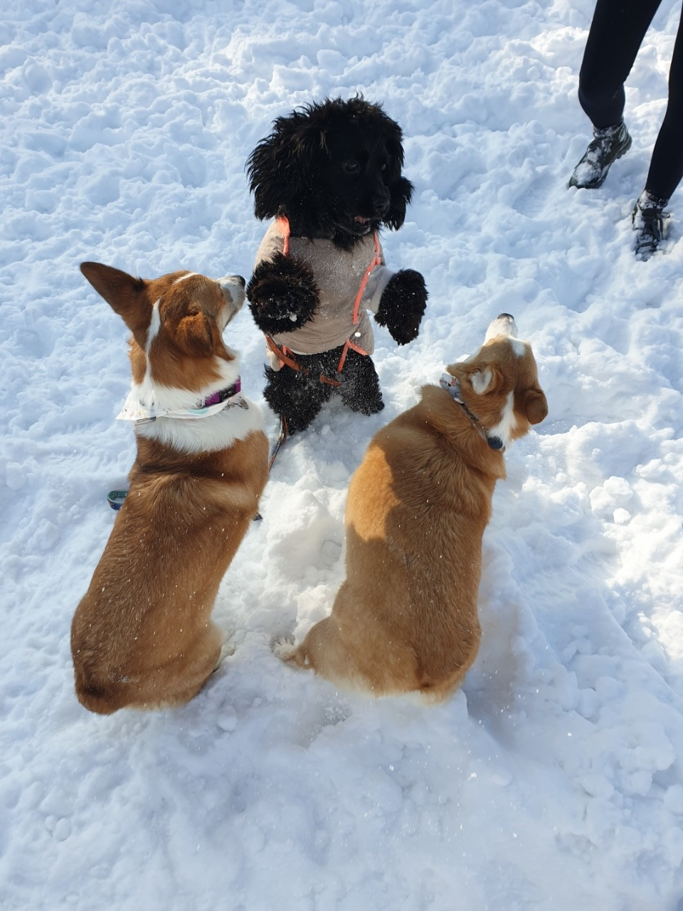대형견을 워낙 좋아하는 덕팔이는 이날 다양한 친구들을 만나 한껏 더 신이난 모습이었다. 리트리버부터 허스키, 코기까지 원없이 새로운 친구들과 신나게 노는 모습이 너무나도 보기 좋고 뿌듯햇다. 발이 크고 털 밀도가 높아 물이나 얼음이 잘 붙지 않는 덕팔이와 다르게 발이 작은 포메인 방울이는 작은 발로 종종종 돌아다니다 불편함을 호소했고, 결국 신발을 신기에 이르렀다. 우리 아이가 눈에서 잘 놀 수 있는 아이인지 아닌지 파악하는 것도 견주의 몫이다. 몇몇 견주들은 강아지들은 당연히 눈에서 잘 놀겠거니 하고 방치하는 모습을 보이기도 했는데 강아지들은 아이와 같아서 항시 눈을 떼지 말아야 한다는 사실을 기억해줬으면 좋겠다.