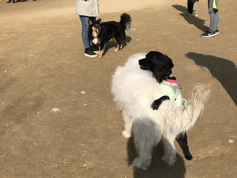 수컷 강아지들의 경우 똥꼬녕하세요로 서로를 탐색하는 과정이 끝나면 얼싸안고서 반갑구먼~반가워요~ 같은 형상을 취하는 모습을 볼 수 있는데 이건 서로 좋아서 얼싸안는 모습이라기보다는 내 키가 더 커! 내 덩치가 더 커! 내가 너보다 위너야! 라는 것을 외치는 모습으로 해석할 수 있다. 덕팔이는 유난히도 키 큰 친구들한테 이런 힘겨루기를 자주 요청하고는 하는데 멀리서 보면 안습이다. 강아지 전용 깔창이 있으면 하나 사주고 싶을 지경.