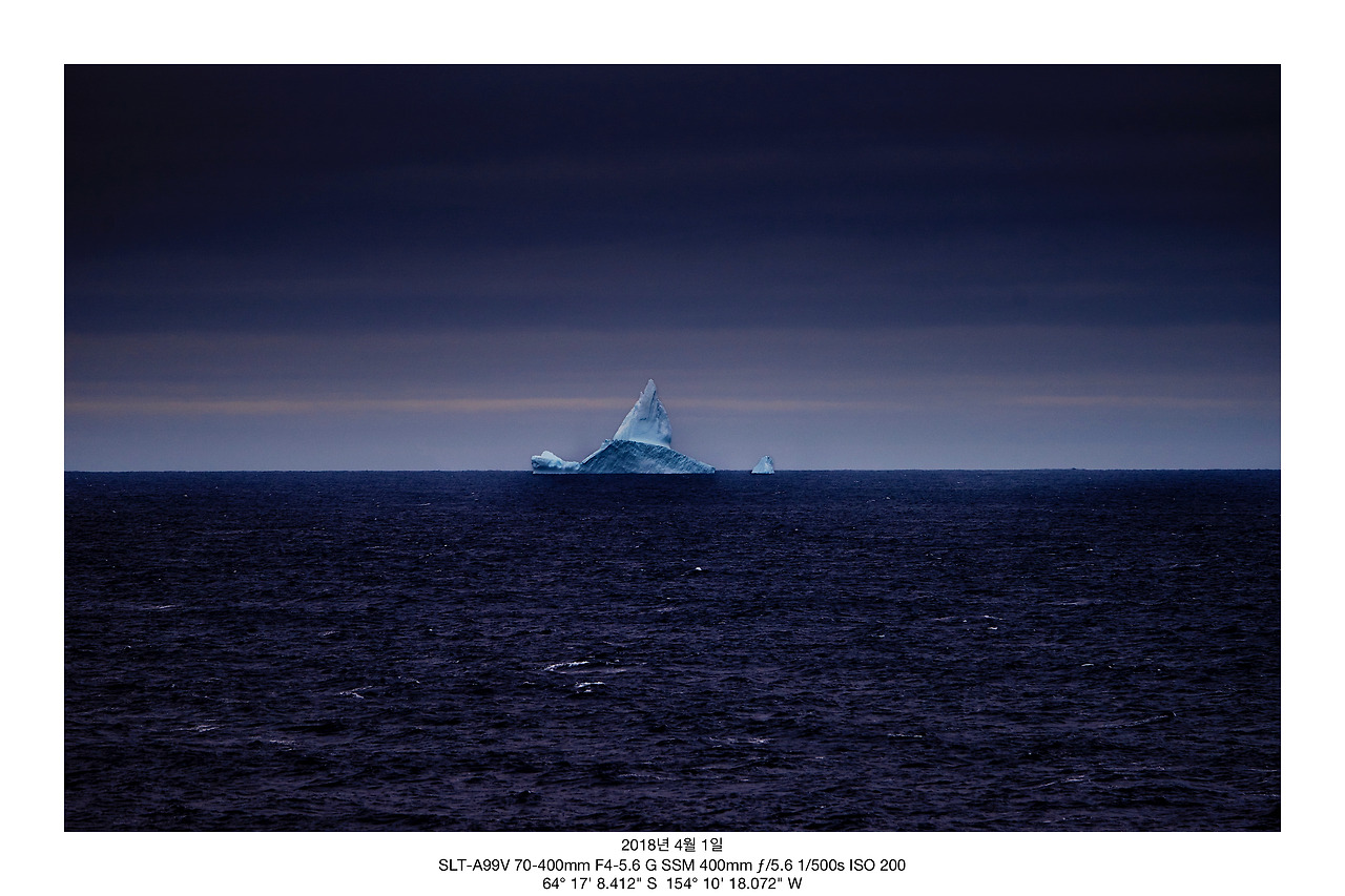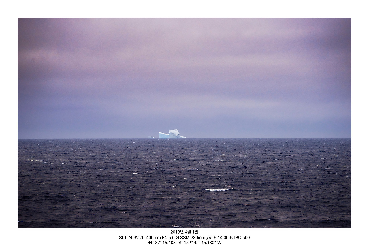 3월 27일 뉴질랜드 리틀톤 항 출항 후 쉬지 않고 남극 반도를 향하여 항해 중이던 아라온. 멍하니 망망대해를 바라보며 일을 하며 지냈다. 그리고 4월 1일 수평선 멀리 무언가 보이기 시작하였다. 멀리서 볼 때 육지는 아닐 것이로 확신하였다. 시간이 좀 더 흐르고 가까이 다가가서 보니 유빙이었다. 유빙을 확인한 후, 대기과학실에서 온도를 살피니 영하에 머물러 있었다. 눈으로 유빙을 확인하고 기온이 영하라는 것을 확인했기 때문이었을까? 그때부터 바람은 차갑게만 느껴지기 시작했다. 아무튼 첫 유빙을 봤으니 무엇을 하겠는가 사진을 찍기 시작했다. 모처럼 멀리 있는 것을 찍으려 하니 무척 힘들었다. 찬 바람이 불 때 잡는 카메라는 얼음 덩어리를 손으로 잡고 있는 듯한 기분이다. 사진을 여러 번 찍었다. '좀 더 가까이 가면 좋을 텐데 좀 더 크게 찍고 싶은데' 중얼거리며 사진을 찍었다. 하지만 배는 내가 원하는 방향으로 가주지 않는다. 아무리 망원 렌즈라고 하여도 멀리 있는 유빙은 확대해봐야 작은 점으로만 보였다. 이것이 아라온을 타고 가며 만난 첫 남극이었다.