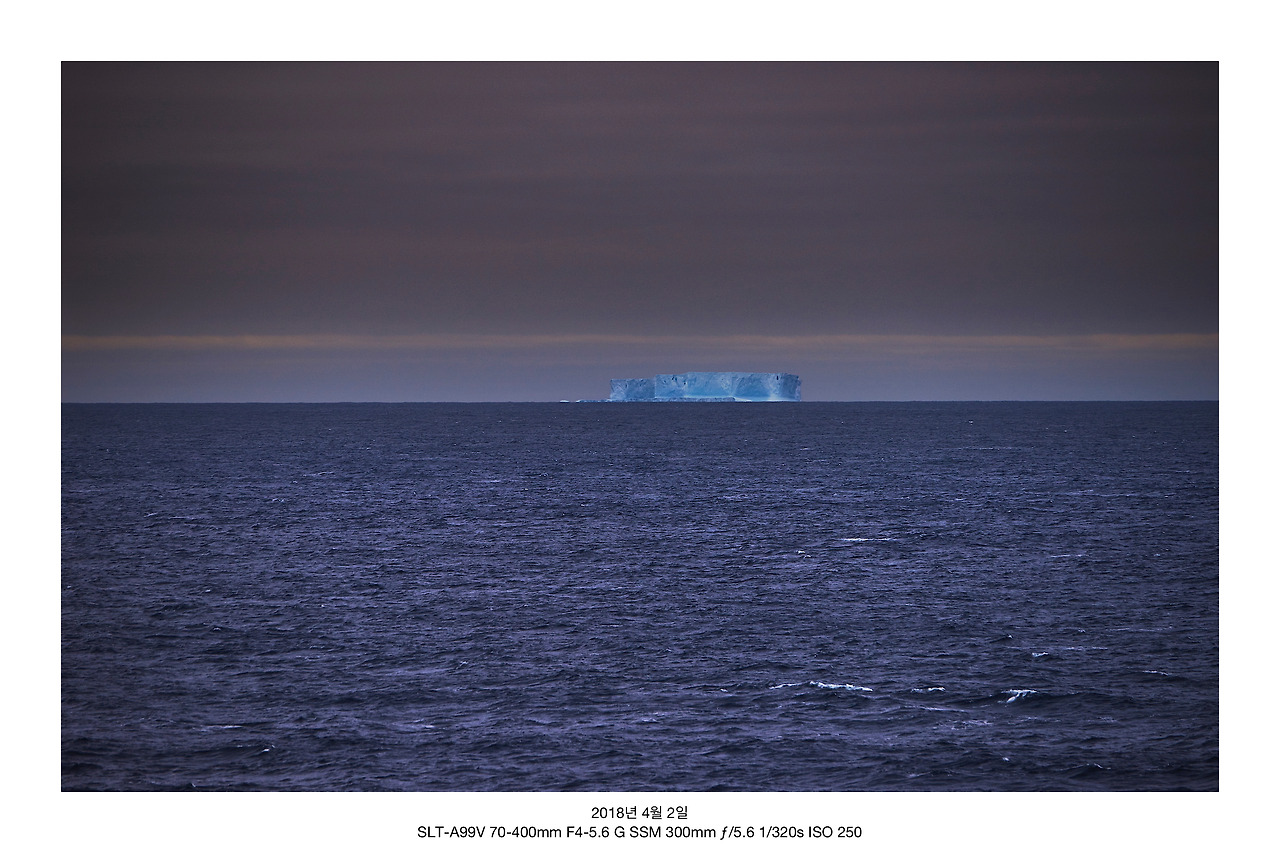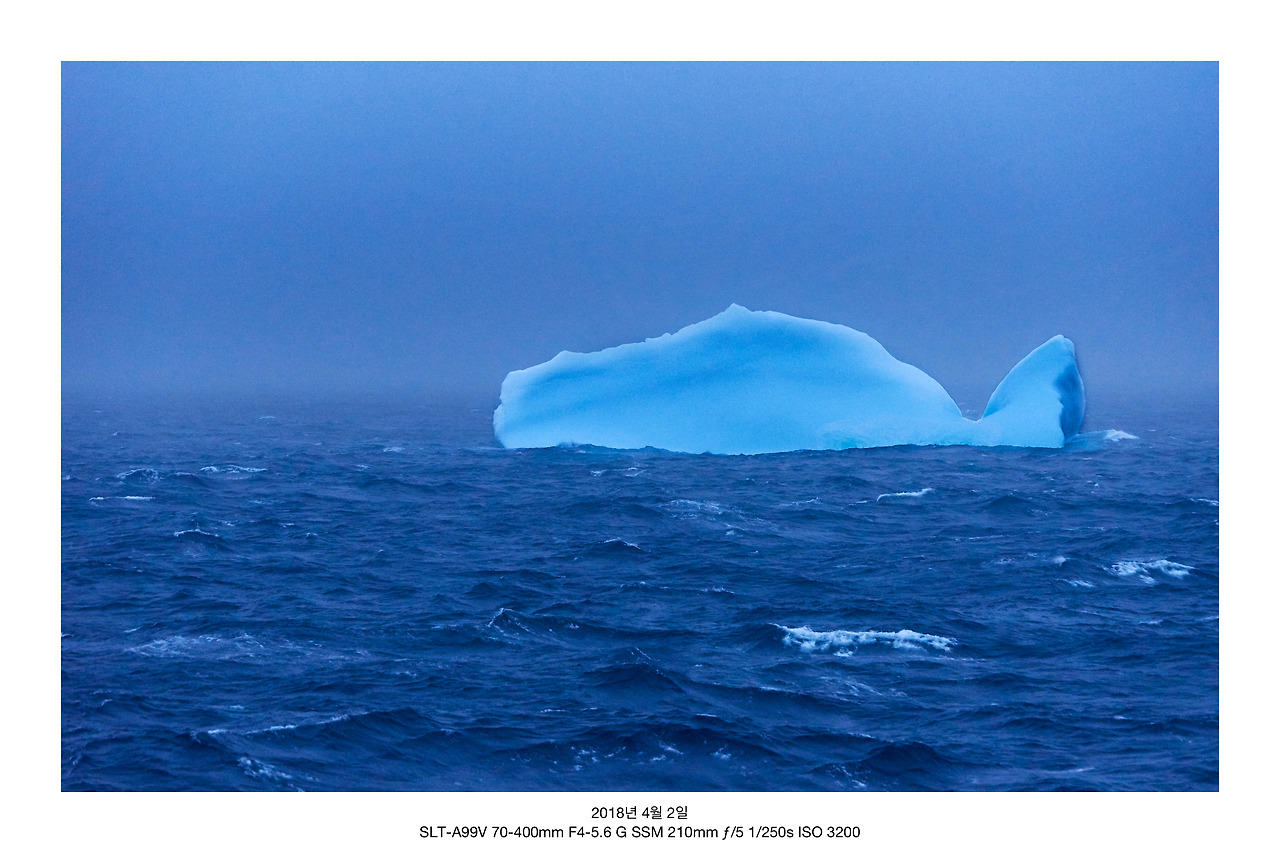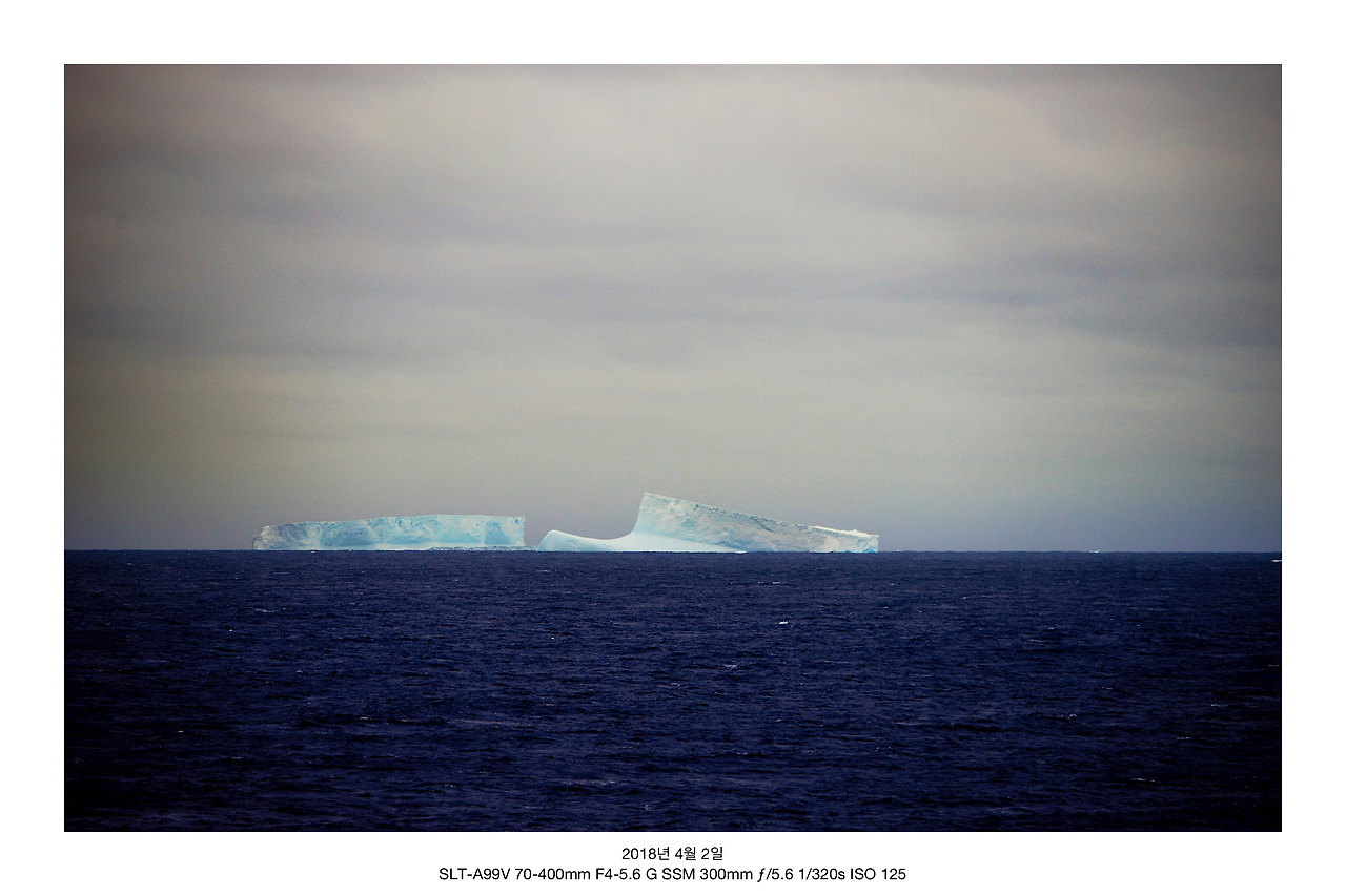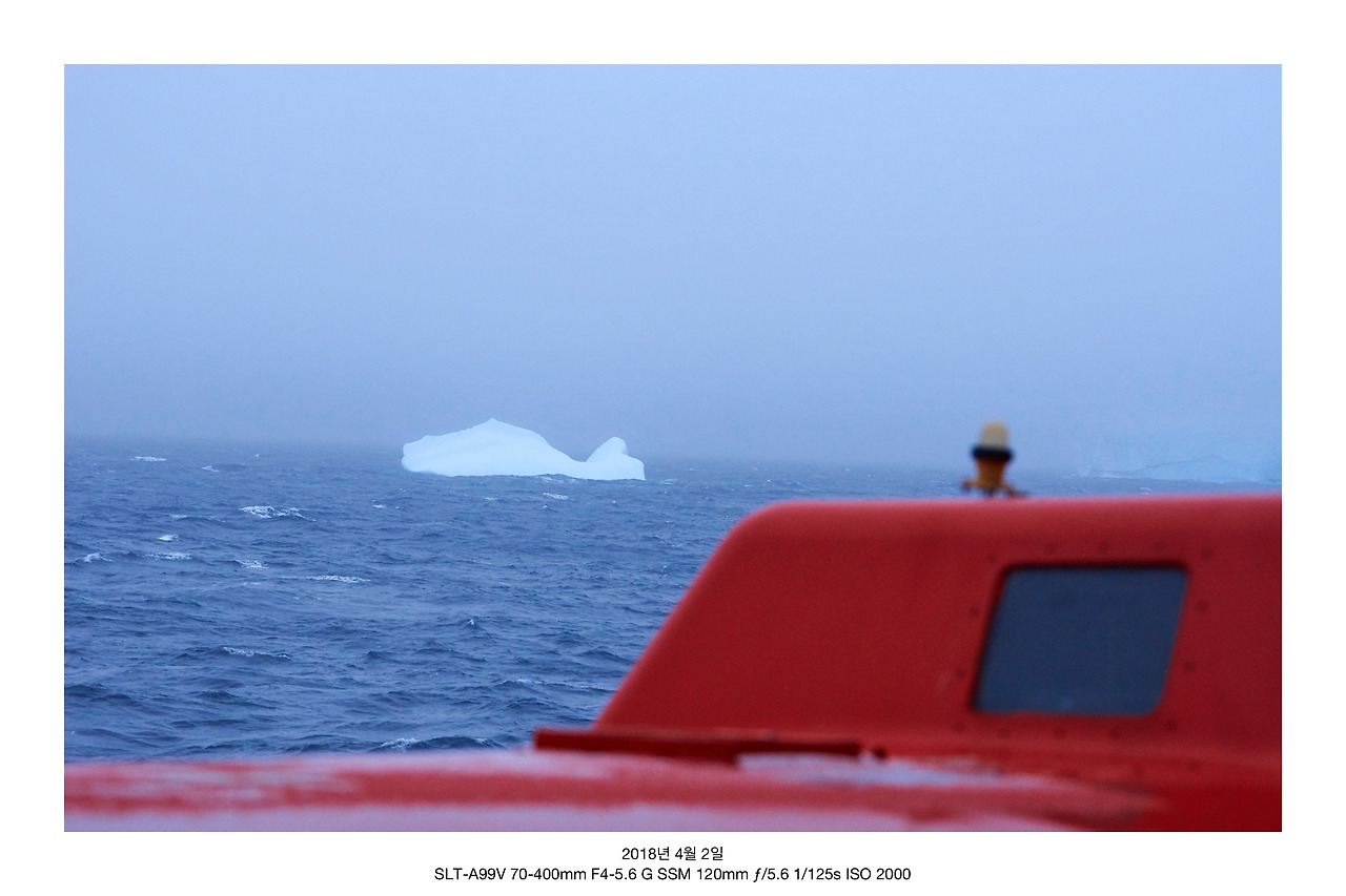 고위도로 갈수록 대기와 바다 상태가 변해가는 것이 느껴진다. 따스했던 뉴질랜드의 대기는 이제 날카롭고 차가운 모습으로 변하였고, 온화하고 부드러워 보이던 바다는 냉정하고 거칠게 변하였다. 같은 대기와 바다가 이렇게 변했다니? 무언가 서럽기도 했지만 당연한 것이다. 뉴질랜드를 떠나온 시간이 얼마인가? 꽤 오랜 시간이 흘러 이동하였으니 변한 것은 당연하다. 대기와 바다만 변한 것이 아니다. 따스한 곳에서는 전혀 볼 수 없는 바다를 표류하는 해빙이 자주 보이기 시작했다. 사실 해빙을 볼 수 있는 빈도수가 증가한 것이 아라온이 얼마나 멀리 와있는지, 우리가 가고자 하는 곳에 얼마나 가까이 왔는지를 실감할 수 있게 한다. 바다 위를 떠다니는 해빙은 저마다 모양과 크기가 다양한데 만날 때마다 묘하게도 이름을 계속 붙여주고 싶었다. 하루 전에 봤던 해빙에는 '마법사 모자', '얼음 굴러가유'라는 이름을 붙여 주었다. 이 날은 전날보다 더 큰 해빙을 볼 수 있었다. 하지만 한 편으로는 마음이 아팠다.