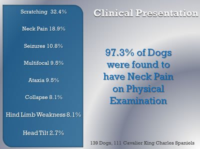 인간의 후두고 이형성에서, 10%의 발작 행동이 발생합니다. 우리는 비슷한 현상을 CLM/SM 의 현상을 보인 캐벌리어 킹 찰스 스패니얼에게서 관찰할 수 있었습니다. 그러나 이 종은, 간질이 발생하는 경향이 있어, 신경학적인 두 가지 혹은 한가지 질병인지 확신하기 어렵습니다. 97% 의 개들에게서 신체검사 중 목의 고통이 있음을 발견했음에도, LIVS(수의학 단체)의 이러한 증상의 많은 연구결과에 따라, 다른 증상이 인지되어야 하고 요약되어야 함을 테이블 1에서 발견할 수 있습니다.