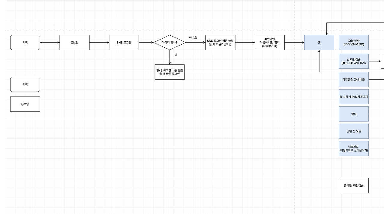 저희 팀이 선정한 서비스 주제는 ‘타임캡슐’입니다. 첫 아이디어 회의 당시 사진 공유, 조별과제, 끝말잇기, 지도, 소개팅 등 다양한 주제가 나왔는데, 그중 모임 기간 동안 실질적으로 구현할 수 있는 범위의 주제(현실은 절대 그렇지 않았고 먼 훗날 출시하게 되는데···)면서 아직까진 해당 서비스가 나름 블루오션이라 판단했어요. 어쩌면, 어릴 적 폴더폰을 경험한 세대라면 한 번쯤은 땅에 캡슐을 묻어버린 경험이 있을지도 모릅니다.