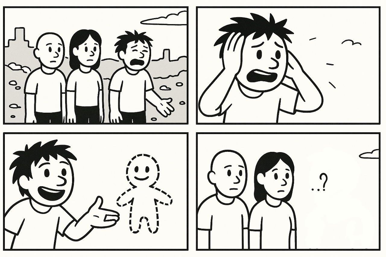 홀로 남은 불쌍한 사람 이야기도 살짝 비틀어 다른 주인공을 넣어봅시다. 지구에 혼자가 아닌 셋이 살아남게 되었다고 하지요. 불행하게도 이전 이야기에서 등장했던 그 사람은 혼자가 아닌데도 외로워 미쳐버리고 맙니다. 다른 두 명에게 ‘내가 생존자를 찾아왔어!’라며 자신의 상상 친구를 의기양양하게 소개하네요. 다른 둘은 그가 가리키는 자리를 보고 아무도 없음을 확인하며 ‘쟤가 결국 미쳐버리고 말았군. 이봐, 그 자리엔 아무도 없다고!’ 하며 안타까워합니다.