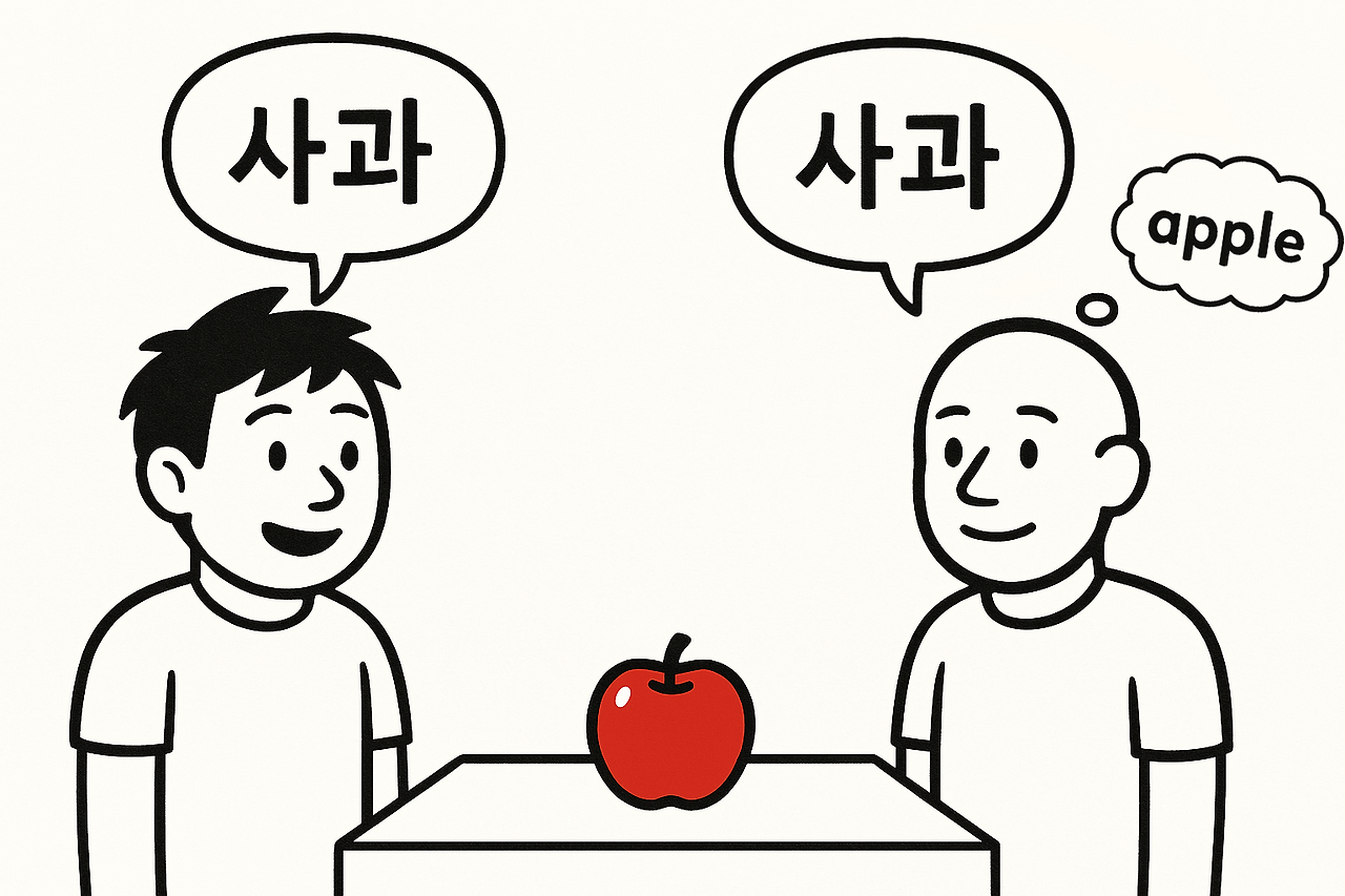 여러분은 무슨 언어로 생각하시나요? 이 글을 읽고 계실 분들은 대부분 한국인일 테고, 한국어로 생각할 것입니다. 하지만 미국에서 태어나 배우고 자란 사람이라면 영어로 말하고 영어로 생각할 것입니다. 탁자에 놓인 사과를 보고, 여러분은 ‘웬 사과가 여기에 있네!’ 하고 말합니다. 마침 어떤 한국말을 잘하는 미국인이 그 광경을 보고는 ‘그러게요, 맛있어 보이는 사과네요!’라고 답합니다. 똑같이 사과라고 했지만 정말 그 외국인도 머릿속에서 ‘사과’라는 단어로 사물을 인식했을까요? 아마도 그렇지 않고 ‘Oh, that’s an apple. Apple is [사과] in Korean.’이라 생각했을 것입니다.