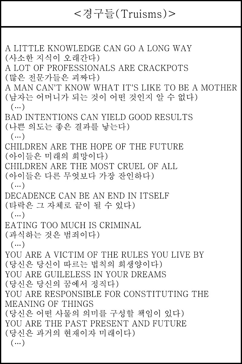 〈경구들〉은 그녀가 대학원을 졸업한 직후 바로 참여했던 뉴욕 휘트니 미술관(Whitney Museum of American Art)의 독립 연구 과정(ISP) 진행 중에 제작한 텍스트 작업이다. 텍스트는 제목과 같이 어디선가 본 듯한 상투적인 문장들로 이루어져 있다. 초기에는 40개에서 60개 정도의 문장으로 구성되었으나, 이후 200개 이상의 문장이 추가되었고, 문장이 시작되는 첫 단어의 알파벳 순서로 정렬되었다. A로 시작하는 문장, "사소한 지식이 오래간다(A LITTLE KNOWLEDGE CAN GO A LONG WAY)"부터 Y로 시작하는 문장에 이르기까지 총 275개의 문장으로 이루어져 있다.
