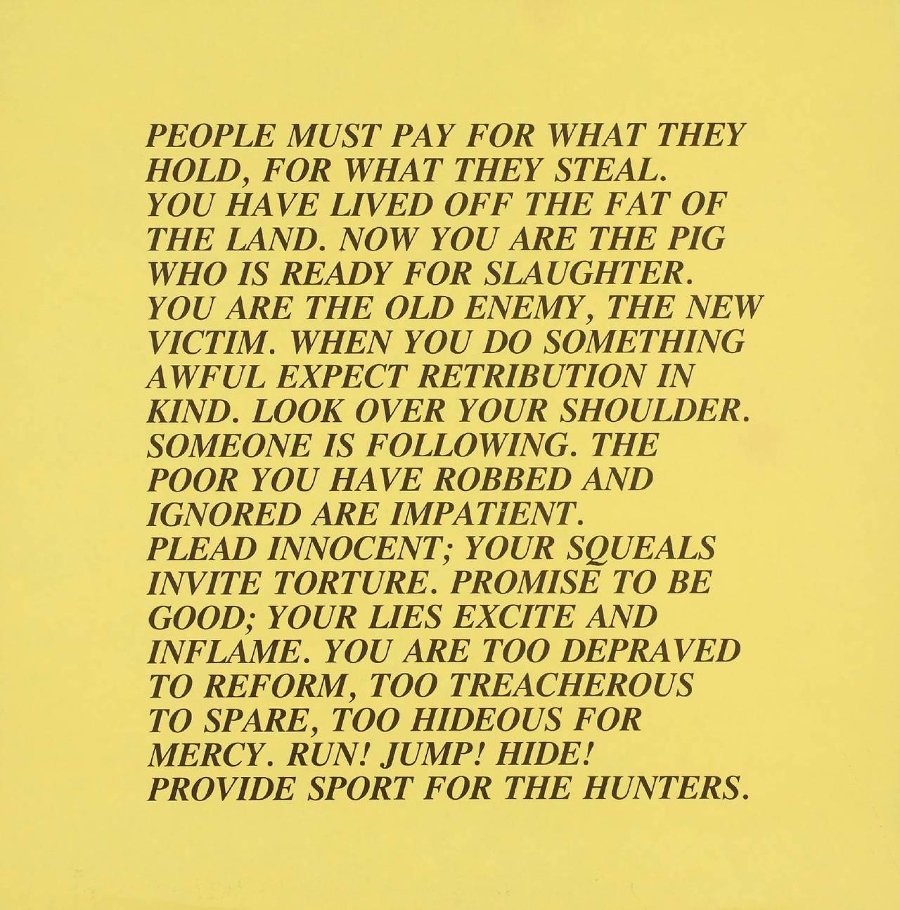 "나의 작품은 사람들이 단지 거리를 걷다가 포스터나 간판을 통해 흔치 않은 문구를 발견할 때 가장 큰 효과를 갖는다. 오히려 갤러리나 미술관에서 전시될 때에는 작품이 도서관에 있는 것 같다. 사람들이 자리를 잡고 앉아서 공부하게 되는 그런 곳 말이다."