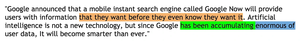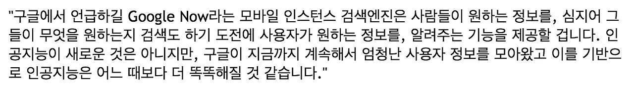 "구글에서 언급하길 Google Now라는 모바일 인스턴트 검색엔진은 사람들이 원하는 정보를, 심지어 그들이 무엇을 원하는지 검색 하기도 전에, 알려주는 기능을 제공할 겁니다. 인공지능 자체는 새로운 것이 아니지만, 구글이 지금까지 계속해서 엄청난 사용자 정보를 모아왔고 이를 기반으로 한 인공지능은 어느 때보다 더 똑똑해질 것 같습니다."