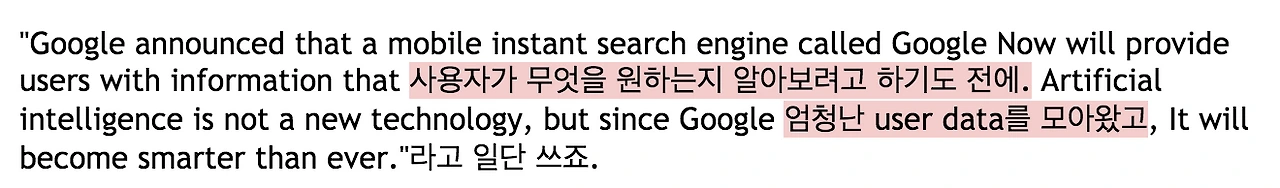 저의 경우, 위에 샘플로 쓴 구글 관련 내용은 관련 정보를 이미 어디선가 제가 읽었기 때문에 가능한 겁니다. 내용, 즉 content가 되는 부분은 제가 만든 게 아닙니다. 리딩이나 영상을 통해 입력된 "정보를 재생산"한 겁니다. 여기에 제 생각과 느낌을 넣으면 제 것이 되는 거겠죠.