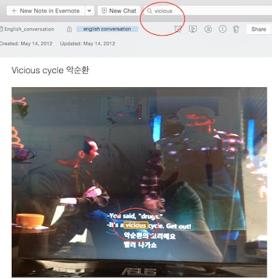 위에 사진은 제가 프렌즈라는 미국 드라마를 보면서 이전에 몰라서 못 섰던 표현 vicious cycle/circle을 발견하고 스크린 샷을 에버노트에 옮겨 놓은 겁니다 (스마트폰에 에버노트 앱이 있으면 바로 노트로 만들어 전송 가능).
