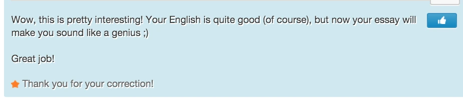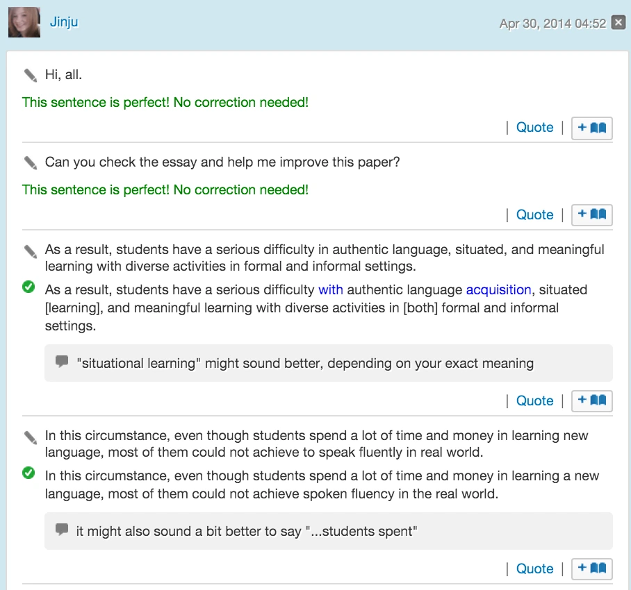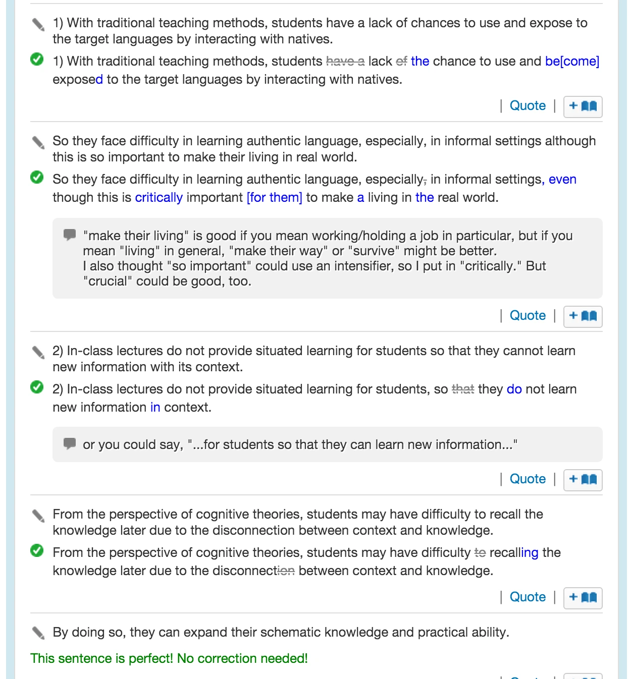 Lang-8은 캐쥬얼하게 무료로 놀면서 배우는 공간입니다. 그래서 영어 수준은 캐쥬얼한 정도지 학문적으론 그렇게 높지 않은 곳이니 언어스킬이 아니라 지식에 대한 건 너무 의지하지 않도록 하세요. 영어로 친구와 대화한다는 태도로 의견만 살짝 얻는 정도로 이용하시면 좋겠습니다.