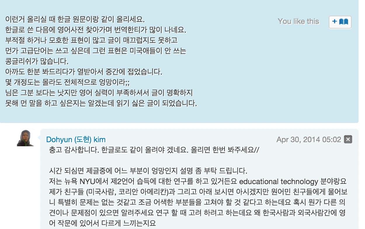 실제 있었던 일로 설명 드리죠. 해당 사이트에선 주로 한국 분들이 올린 영어나 한글을 배우는 외국인의 글을 고쳐주면서 영어가 늘었는데요. 어느 날 한국분이 제가 올린 영작에 대해 너무 한국적이고 사전을 사용한 티가 많이 난다고 말하죠.