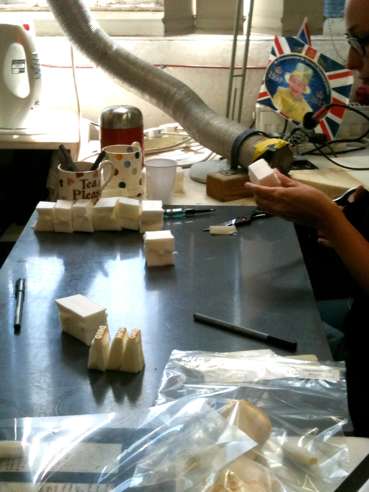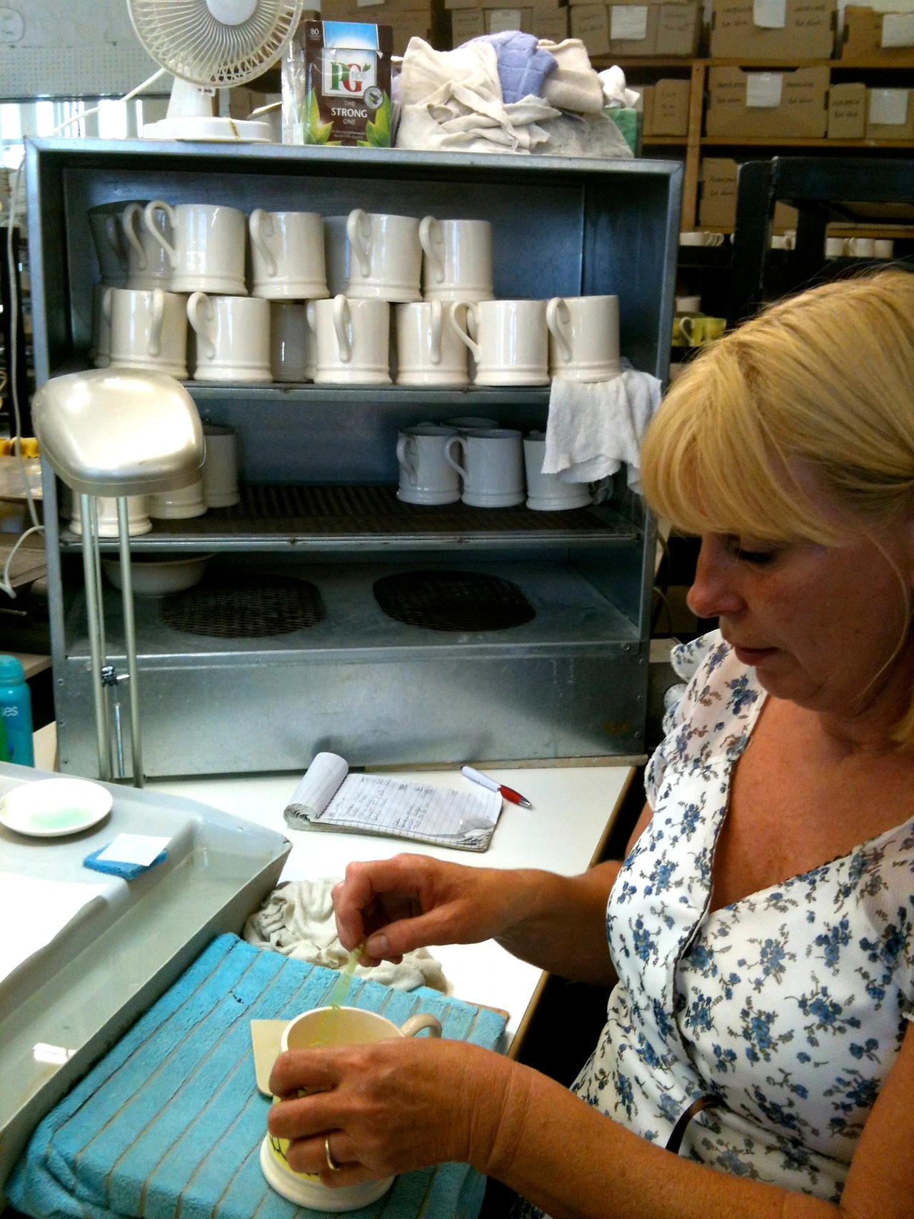 두 번째 특징인 스펀지 웨어(Sponge ware)는 말 그래도 스펀지를 이용해 장식한 도자기를 말한다. 필자가 공장 방문 시 스펀지 웨어 장식하는 기법도 볼 수 있었다. 패턴 디자인이 나오면 끝이 뾰족한 인두로 하얀 스펀지를 세밀하게 디자인에 따라서 조각을 한다. 불필요한 부분을 열로 녹여서 없애는 방법이었다. 그 후 초벌 된 기물에 여러 가지 색을 입혀서 스펀지로 콕콕 표면에 찍어줍니다. 에마 브릿지워터의 시그니처 패턴이기도 한 물방울 패턴은 이런 식으로 만들어졌다.