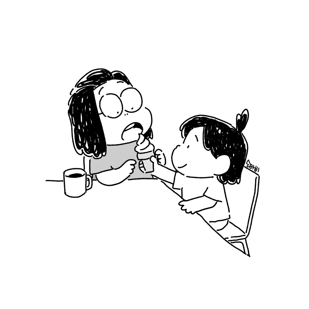 아들이 아이스크림을 엄마 입에 가져다준다.