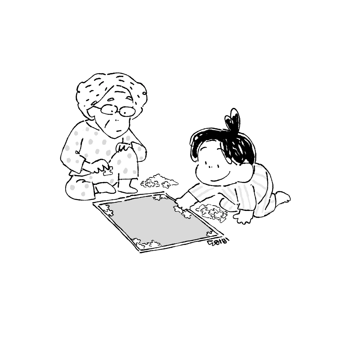 “할머니, 이 조각 거꾸로 끼웠어요.”