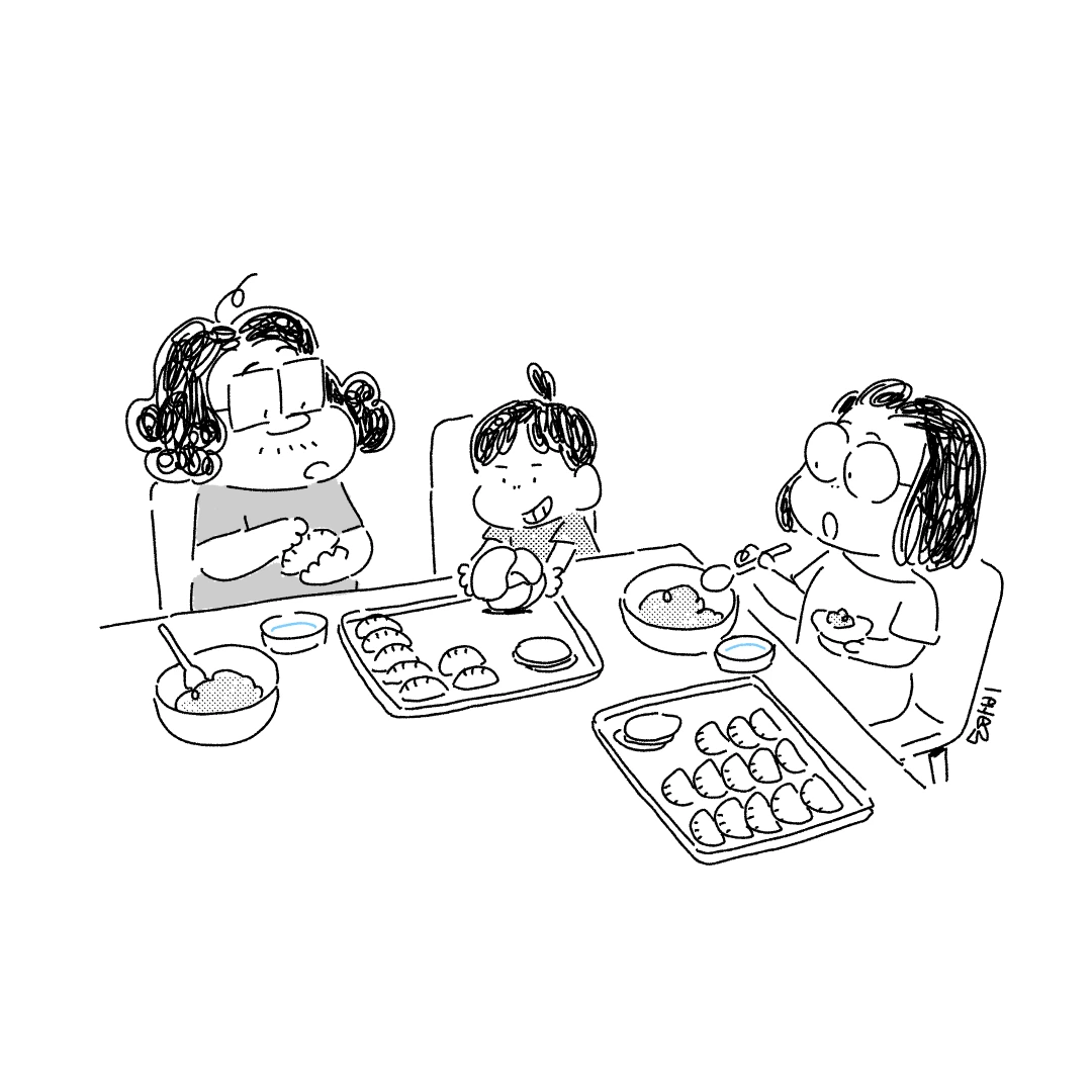 그래서 몇 년 전부터 만두를 빚기 시작했다. 아내가 만두소를 준비한다. 돼지고기, 김치, 새우. 세 가지다. 숟가락으로 만두소를 적당히 떠서 만두피에 올린다. 조물조물 만두피를 오므리며 모양을 잡으면 끝. 처음엔 만두소 양도 못 맞추고, 모양을 잡느라 낑낑댔다. 한 개를 빚는 데도 한참이 걸렸다. 지금은 반달 모양도, 동그란 모양도 제법 익숙하다. 꾸준히 하다 보니, 늘긴 는다.
