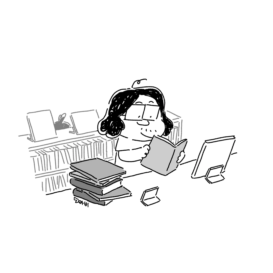 사냥하듯 어린이책 코너를 천천히 한 바퀴 돈다.