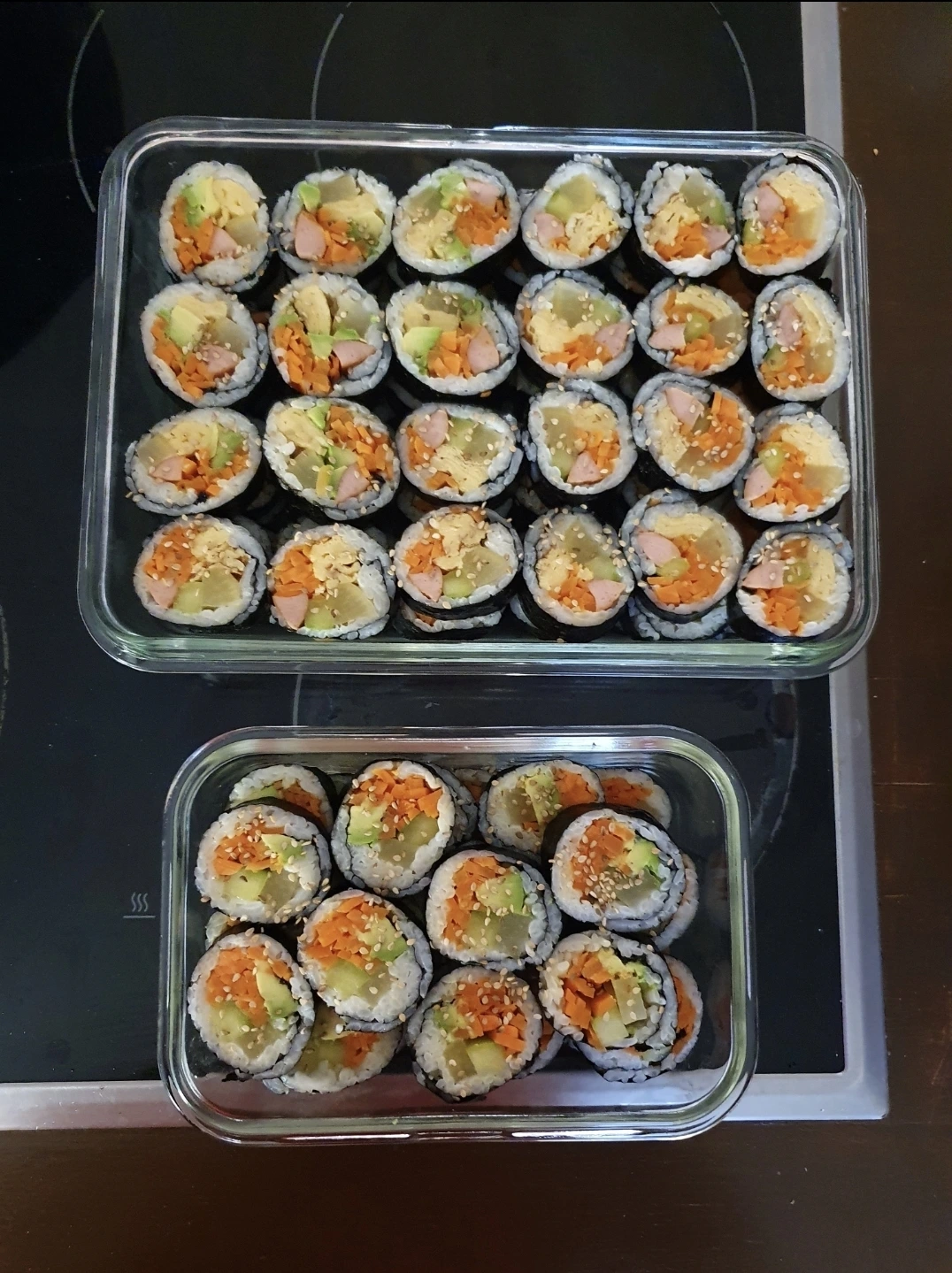 엄마가 선생님 거는 소시지 안 넣고 아보카도 넣고 했는데 선생님은 김이 맛이 없다며 안 먹었고, 친구들도 많이 안 먹어서 거의 다 남았는데 쌍둥이 친구들이 김밥을 너무 좋아해서 집에 가서 먹으라고 통 채로 줘버렸다.