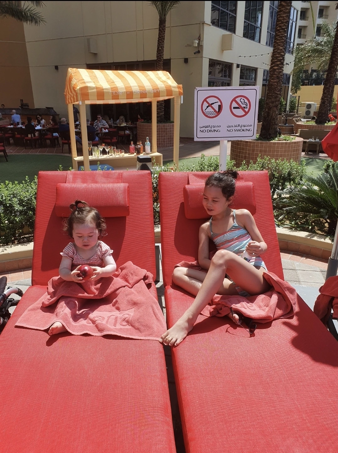 뮌헨-두바이 비행은 밤비행이라 비즈니스석으로 탔다(아빠 회사 직원할인을 받아서 이코노미나 비즈니스나 가격은 비슷하다) 비즈니스석은 밥도 맛있고, 텔레비전도 크고 불편하지도 않고 너무 좋아서 오래오래 타고 싶은데 비행시간이 6시간 밖에 되지 않아서 아쉬웠다. 도착해서 호텔로 이동하려고 택시를 타고 가는데 건물들이 엄청 높았다. 이런 걸 처음 보는 얀네는 진짜 신기해하면서 계속 뭐라 뭐라 얘기했다. 호텔에 도착해서 짐을 맡겨두고 산책을 나갔다. 아침일찍이라 체크인을 안 해줬었다. 날씨도 따뜻하고 바닷가 주변에 상점들도 엄청 많고 여기 맘에 들었다. 체크인하고 엄마는 얀네랑 낮잠 자러 가고, 나랑 아빠는 수영하러 갔다. 호텔직원분들은 특히 우리 가족에게 친절했다. 그러곤 우리가 어느 나라 사람인지 물어봤는데 엄마가 한국사람이라니까 자기 동생이 한국에서 공부를 했네, 자기가 한국을 좋아하네 어쩌네 하면서 늘 우리에게 잘해줬다. 엄마가 유모차 끌고 가면 짐 들어주고, 유모차 들어주고, 우리가 오면 자리 만들어서 파라솔 켜주고, 햇빛이 방향을 바꾸면 파라솔을 옮겨서 그늘을 만들어주고 뭐 하나라도 물어보면 다 해결해 주고 마주칠 때마다 늘 반갑게 아는 척해줬다... 엄마는 너무 고마워했고, 아빠는 자기 일 덜어줘서 편안해했다.(방글라데시에서 온 이샹삼촌 고마워!)