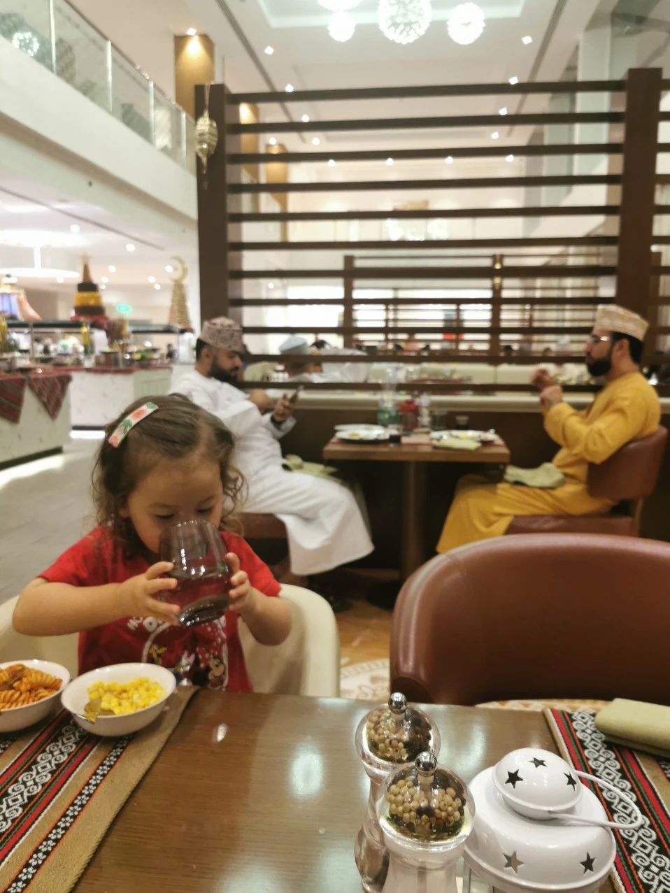 결국 우리는 오만자동차보험을 따로 또 샀다. 엄마가 독일서도 차가 돈 다 잡아먹는데 여행 와서도 그렇다고 렌터카를 욕했다. 마지막 입국까지 10번 정도 입국심사를 거쳤던 것 같다. 차 세관 비자 등등등... 나는 왜 여길 일부러 와서 이 고생을 하는지 도대체 모르겠다. 그냥 푸자이라로 돌아가서 요수아랑 계속 놀고 싶었다. 입국하는데 4시간 반이나 걸려서 호텔에 도착하니 저녁 7시였다. 차에서 커다란 kfc 치킨을 먹고 배가 고프지 않았는데 그래도 저녁을 먹으러 뷔페에 내려갔는데 여긴 관광객이 없었다. 남자 여자 어린이 모두 몸 다 가리는 옷을 입고 있는 여기에 사는 사람들이었다. 음식을 둘러봤는데 음... 나는 못 먹을 것 같다. 엄마는 후무스를 좋아했는데 여기 호텔 후무스는 못 먹겠다고 했다. 이 호텔은 여행 오는 사람보다 여기에 사는 사람들이 더 많아서 그런지 음식이 전형적인 오만음식이라 나는 못 먹겠다. 난 케밥하나를 겨우 먹었고 얀네는 옥수수만 먹더니 김밥 달라며 떼를 썼다