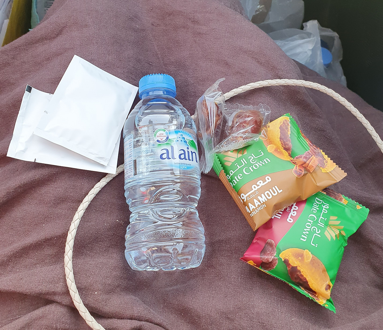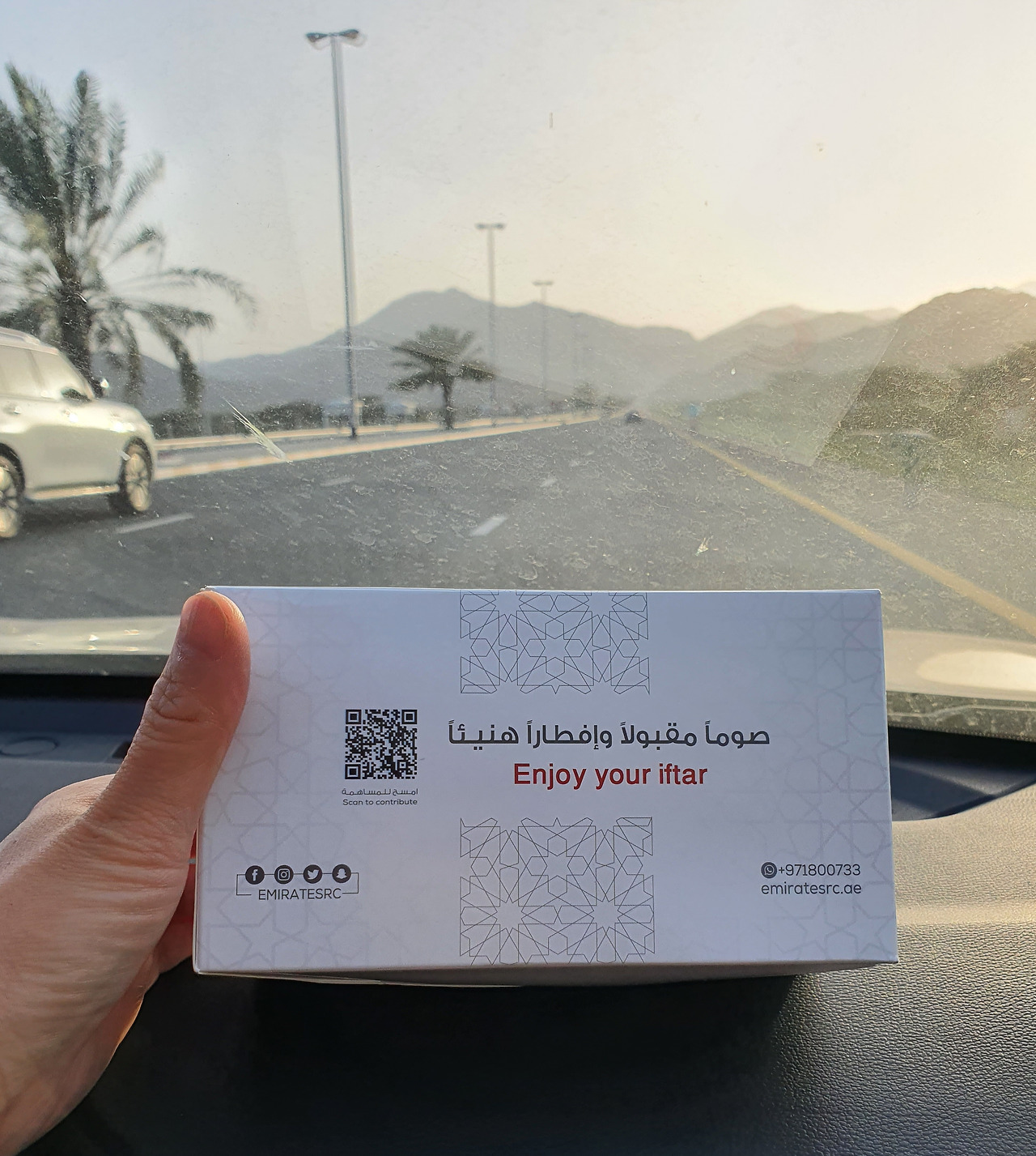라마단기간이라 뭘 사 먹을 수 있는 레스토랑도 없고 주유소에서 파는 과자 아이스크림 이런 것만 먹으며 겨우 견디는데 에미레이트에 입국을 하니 어떤 사람들이 선물을 나눠줬다. 잘 모르지만 아마 홍보용인 것 같은데 어쨌든 국경 넘자마자 선물을 받으니 신기했고, 간단한 간식이었기에 감사히 먹었다.