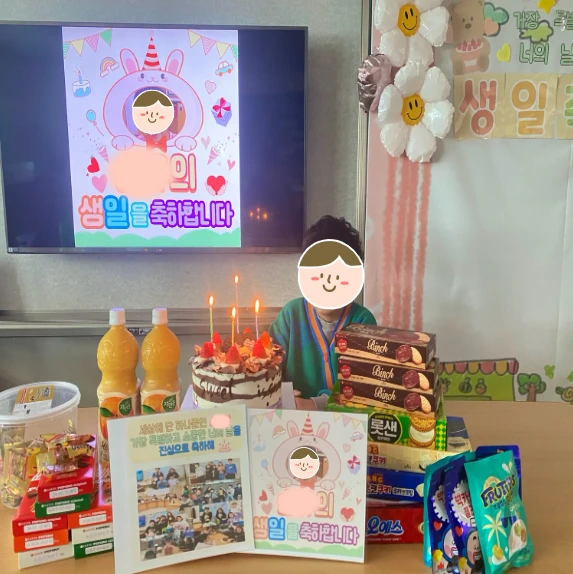 내일 생일인 친구를 위해 교실을 꾸민다.