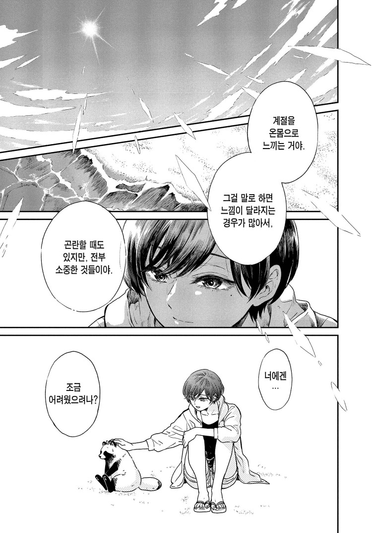 주인공과 개가 해변에 간 에피소드가 있다. 개는 “즐거워.”라는 메모를 보여준다. 대체로 따뜻한 반응을 보여주던 주인공은 어쩐지 냉소적으로 답한다. “그래… 잘됐네.” 그러자 개는 “안 즐거워?”, “즐겁다고 말해!!”라며 주인공에게 즐겁다는 말을 듣고자 한다. 이에 대한 주인공의 대답은 신중했다. “…여름 햇살에 바다 냄새. 계절을 온몸으로 느끼는 거야. 그걸 말로 하면 느낌이 달라지는 경우가 많아서.” <비와 너와>는 혼자도 잘 살고자 하며 같이도 잘 사는 성숙한 어른의 태도를 그린 작품이다. 그러므로 불안함을 인정하고 희망을 품는 태도도 자연스럽다.