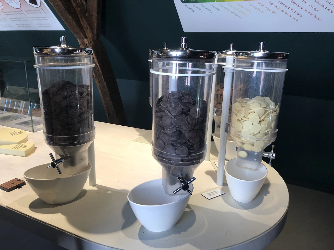 무료로 초콜릿을 준다기에 폐장 시간을 1시간 앞두고 '초콜릿 박물관'을 찾아갔다. 입구에서 하나씩 나눠준 동전 크기의 초콜릿이 전부인가 싶어 약간 실망해 입안에서 살살 녹여먹으며 둘러보는데, 무료 초콜릿 시식 코너가 짠하고 나타난 거다!! 카카오 배합과 당도별로 마음껏 먹을 수 있어 아이들 두 명과 열심히 우걱우걱 집어 먹었다.