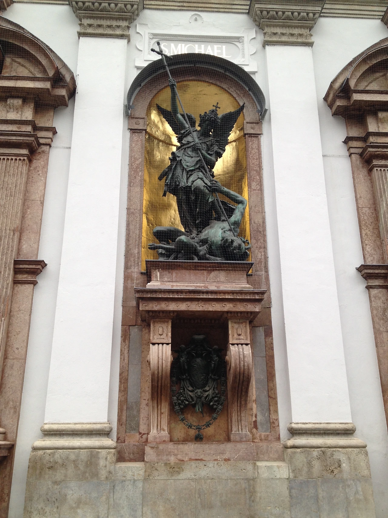 다음으로 간 곳은 마틴 루터의 종교개혁에 반대한 가톨릭 부흥의 상징인 성 미카엘(St. Michael) 성당이다. 이름에 걸맞게 성당 입구엔 천사군을 지휘해 악마를 무찌르는 대천사 미카엘의 동상이 있었다. 화이트와 골드가 조화롭게 섞인 로코코 양식의 아름다운 실내가 눈을 황홀케 했다. 이 성당 지하에 백조성의 루트비히 2세를 비롯한 비텔스바흐 가문의 왕족들이 영면하고 있다.