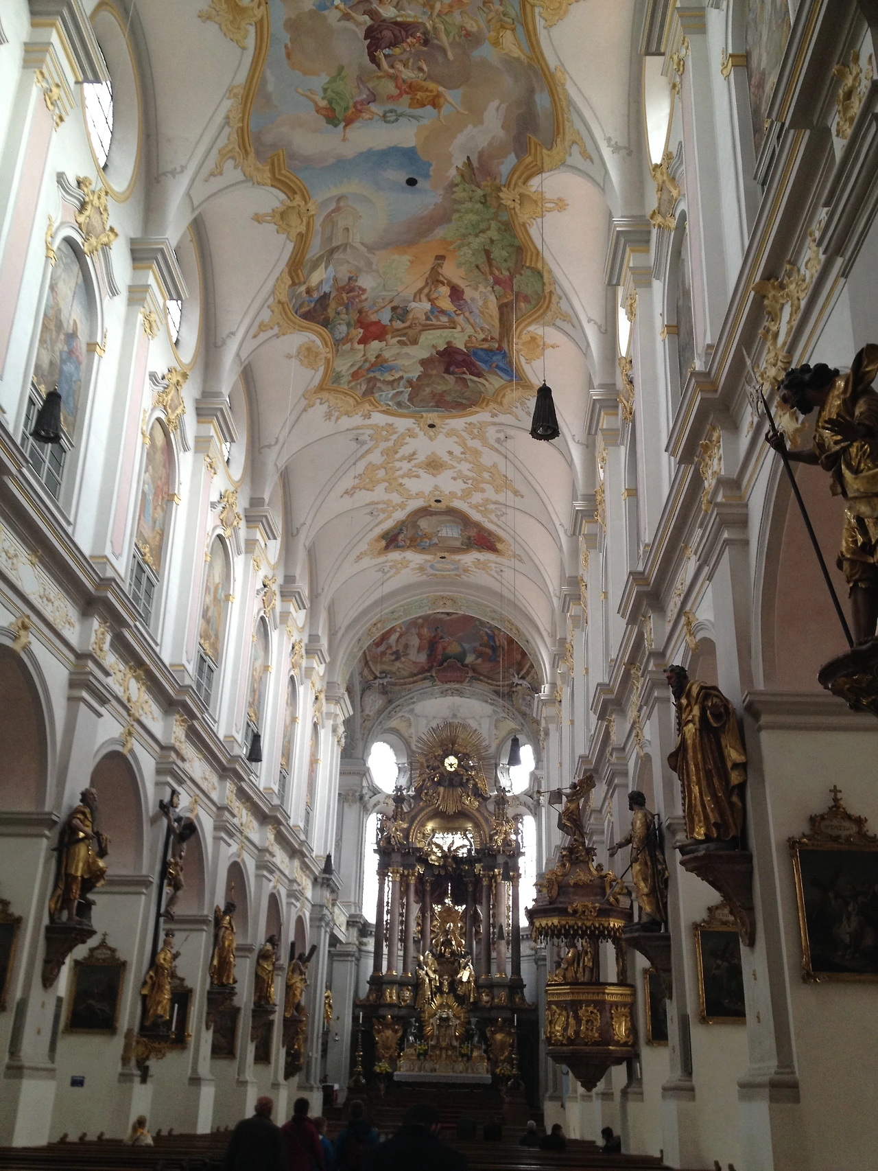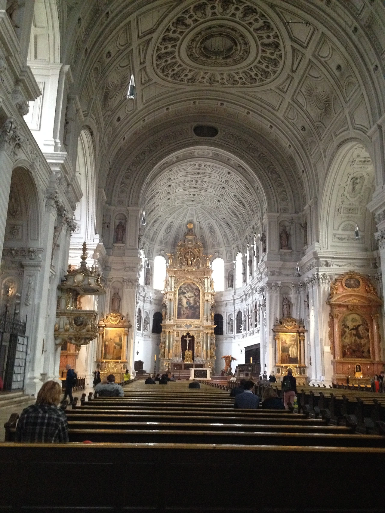 시청사 앞 식당에서 점심을 먹고 난 후 다음 목적지인 성 페트리(St. Peter) 교회로 갔다. 뮌헨에서 가장 오래된 교회라는데, 내부로 들어가 보니 과연 성화와 조각들 특히 천장 프레스코화가 단연 돋보였다. 뮌헨은 가톨릭의 도시이기도 한데, 지명 자체가 수도승을 뜻하는 독일어 '무니히'에서 따왔다. 초기 성 베네딕토 수도회 수사들이 정착하면서 마을이 형성돼 독일에서 세 번째로 큰 도시로 성장했다.