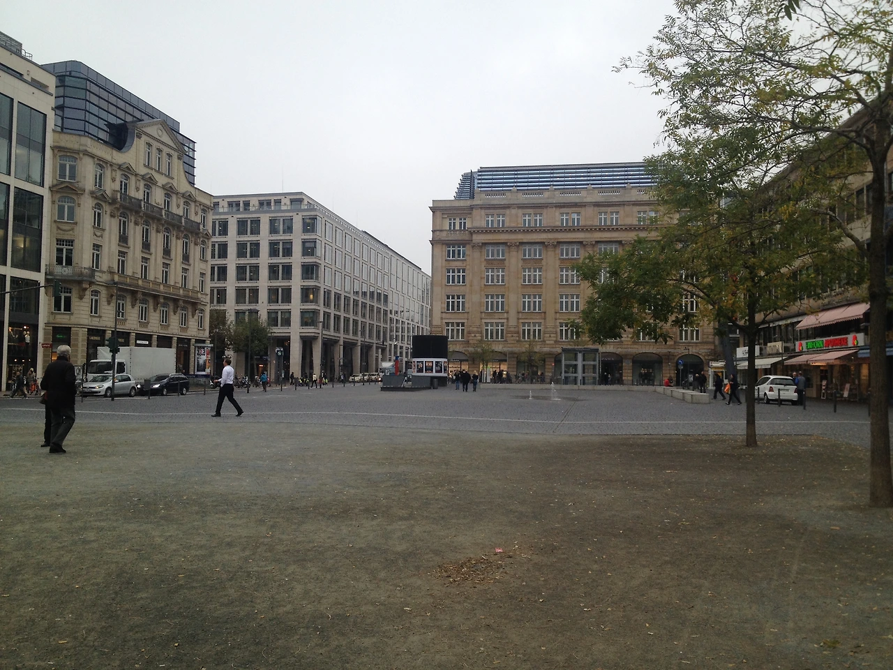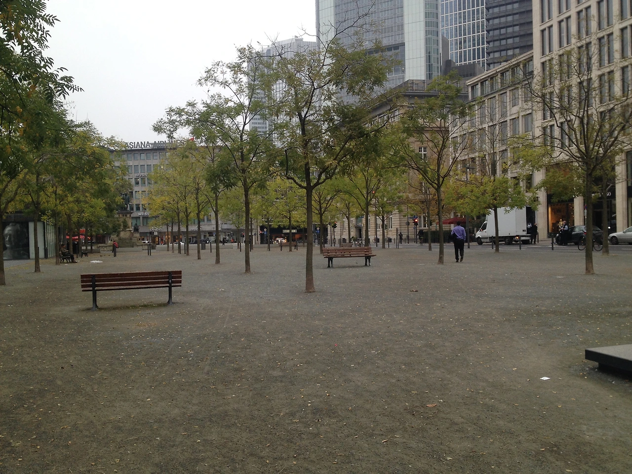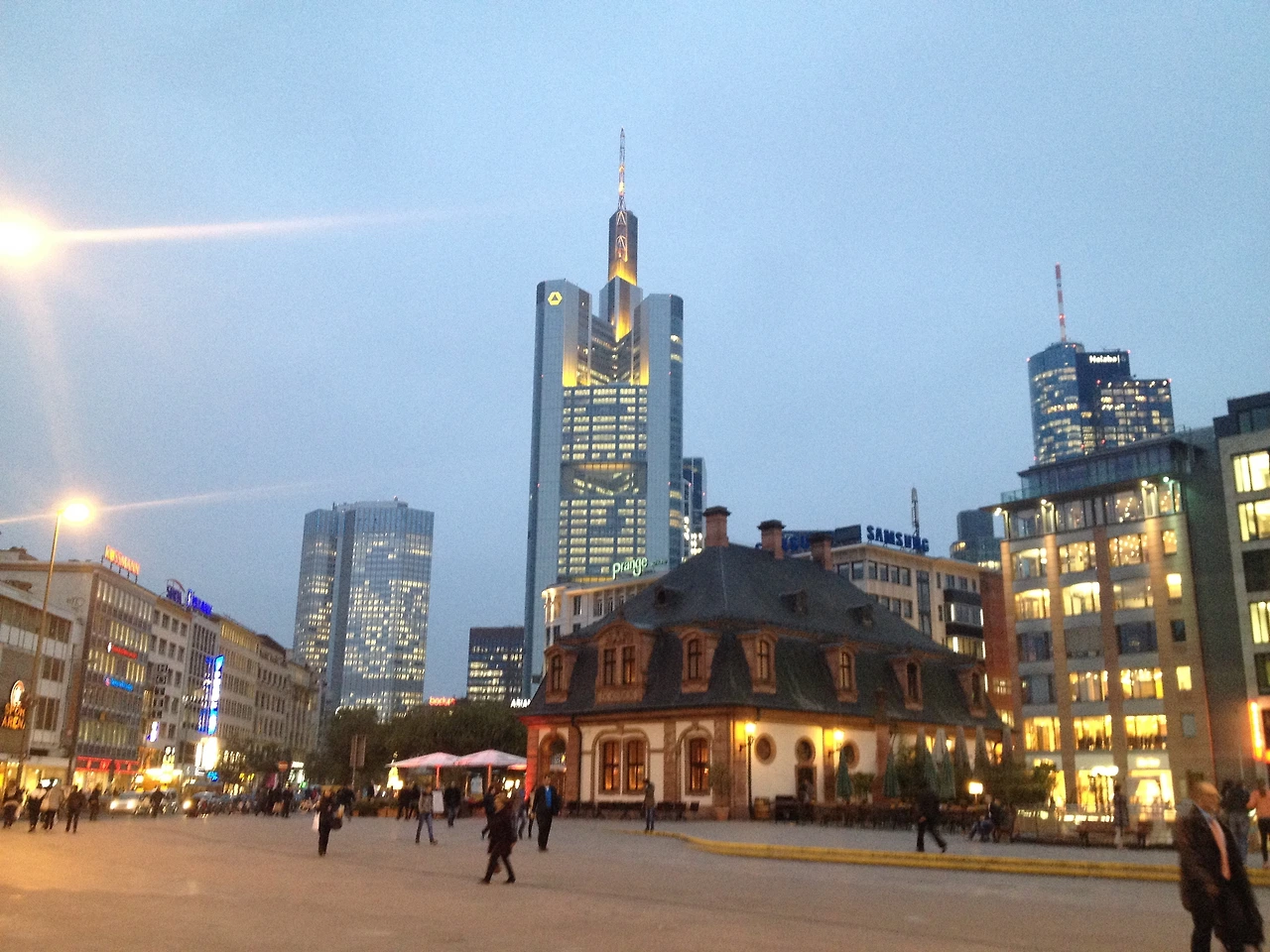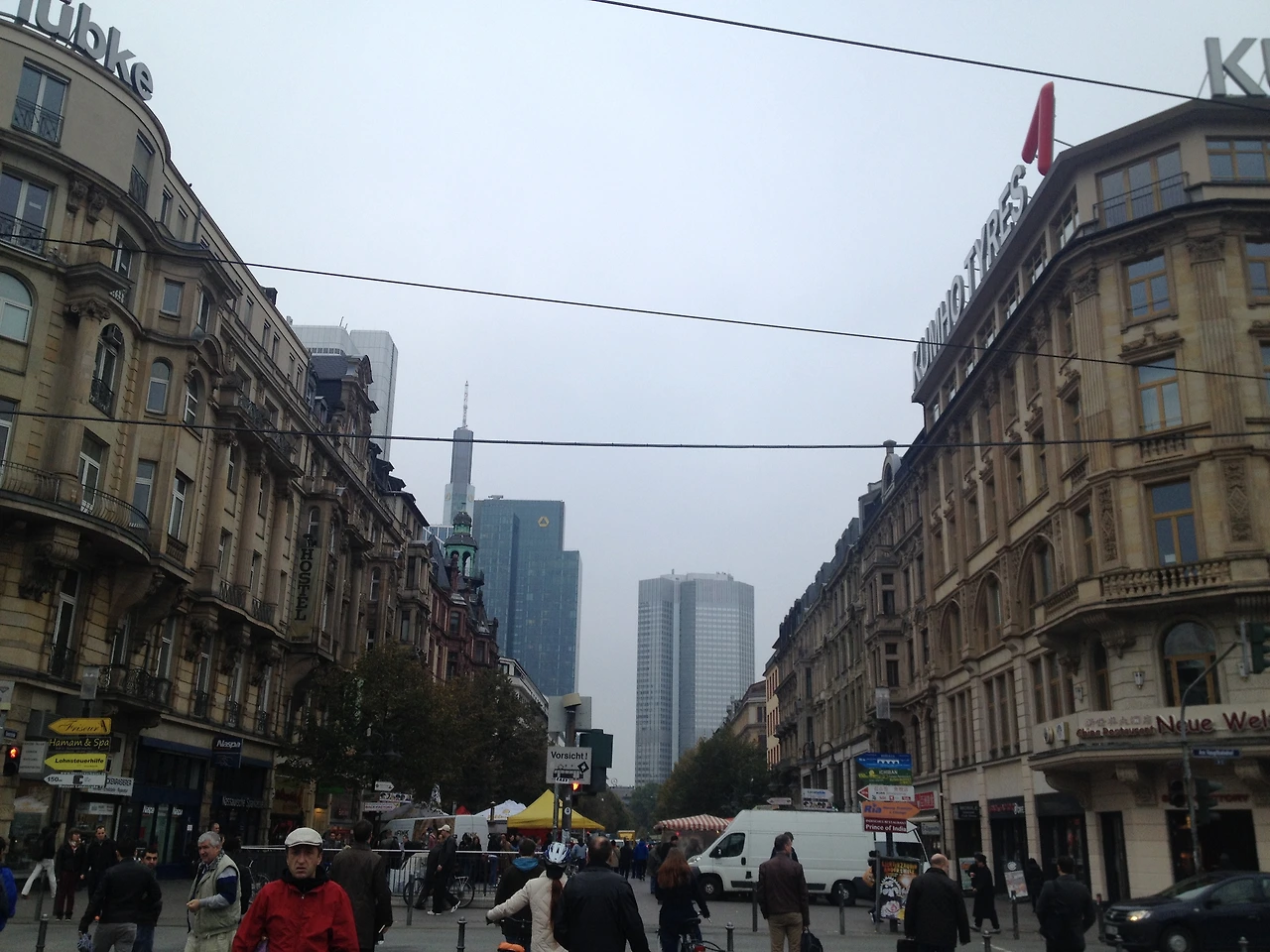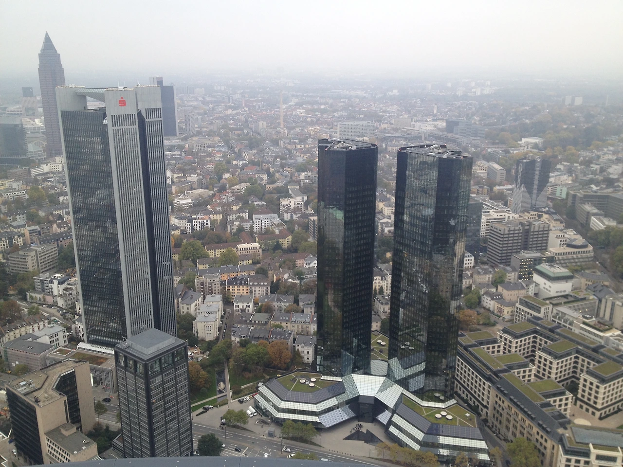오른쪽 쌍둥이 빌딩은 독일 최대 은행인 도이체스 은행(Deutsche bank)이다. 이 도이체스를 바짝 추격해 오는 코메르츠 은행(Commerz bank)이 프랑크푸르트에서 가장 높은 (258m) 건물을 지으며 대응해오자 아예 쌍둥이 빌딩을 지었다는 재미있는 이야기가 있다. 게다가 한국 유학생 대부분이 도이체스 은행에서 계좌를 개설하는데, 거의 30~40유로에 해당하는 사은품을 준다고 해 울 아들도 당장 개설해줄까 잠시 엉뚱한 고민을 했다.
