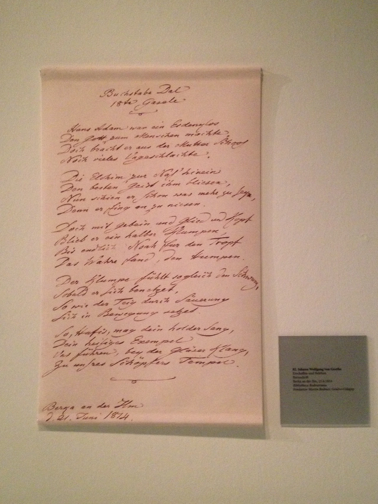내부에 들어서자 한 복판에 널찍한 강의실이 있었는데, 아마도 각종 문화 행사들을 하는 곳인 듯싶었다. 그 둘레로 작은 박물관이 있었는데, 대부분 괴테가 남긴 노트나 편지들이었다. 독일어 문맹자라 무슨 내용인진 모르겠으나, 글씨체는 정말 명필임은 한눈에 알아볼 수 있었다. 얼마나 유려하게 썼을까... 그러니 여러 여자들이 그 앞에 무릎을 꿇었을 테지...