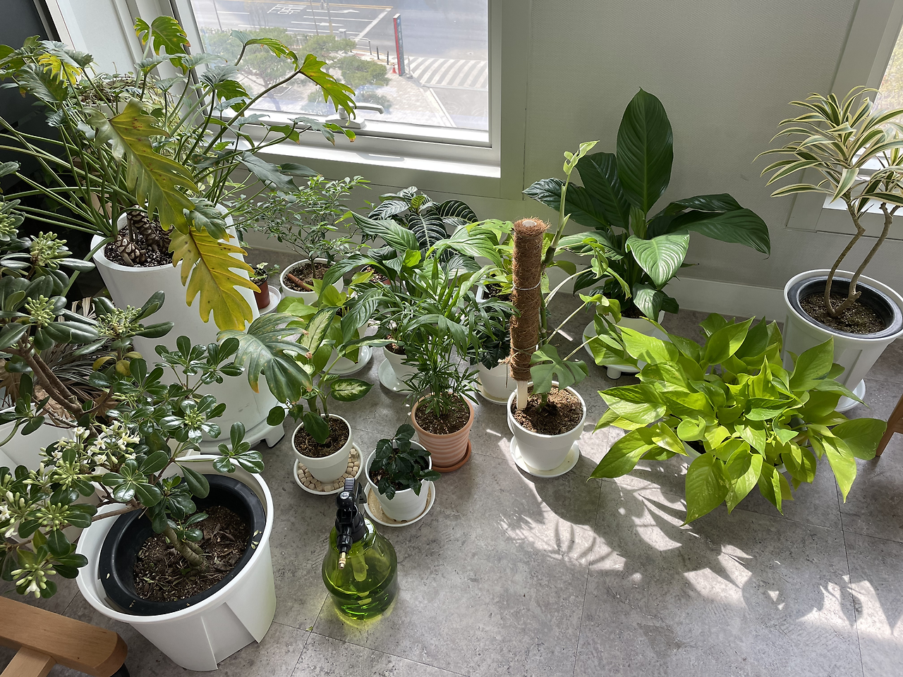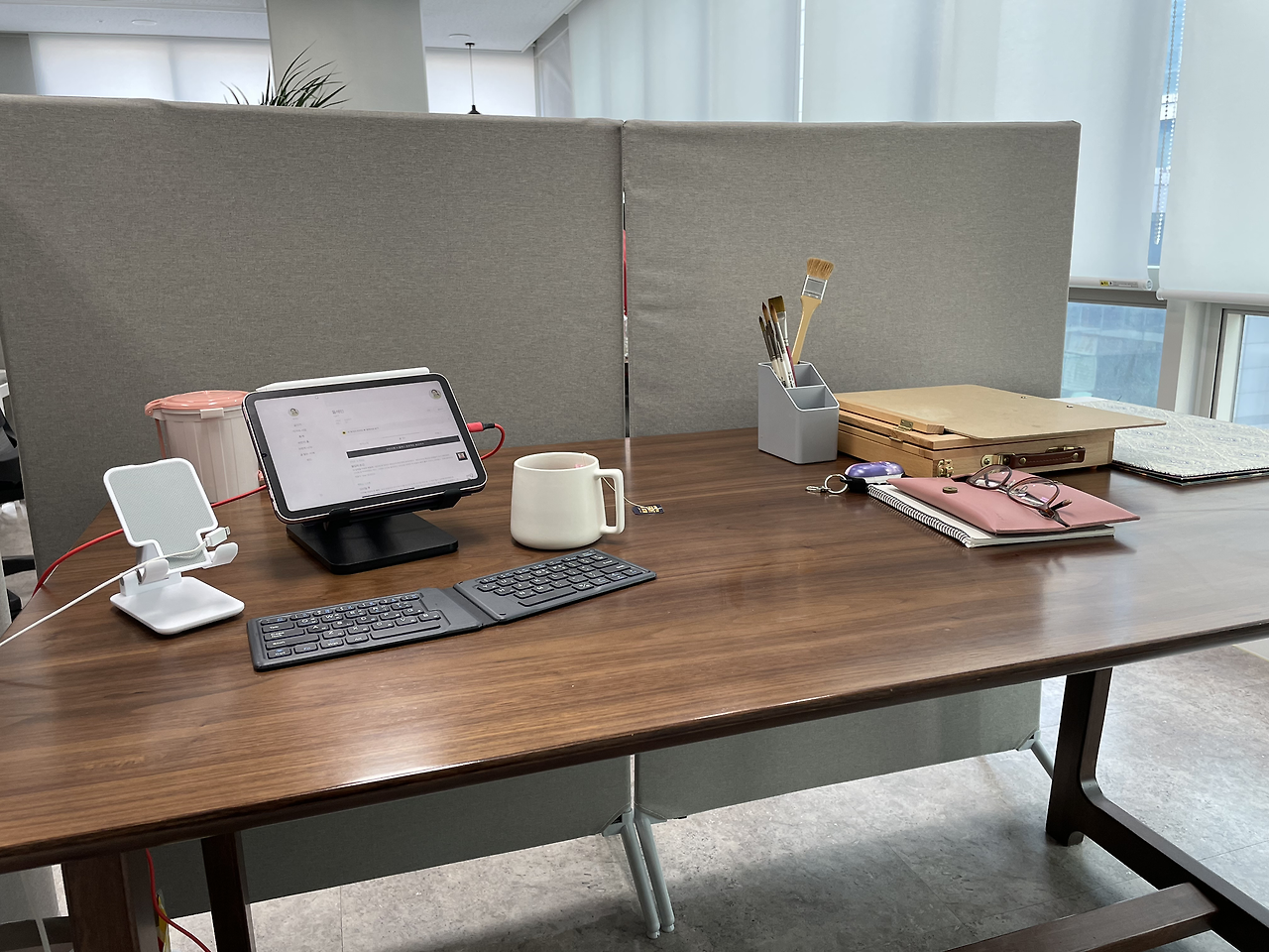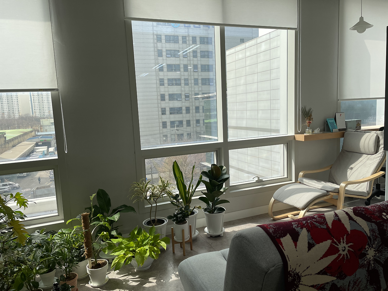 작업실 주인이자 메인 작가분이 패턴 일러스트 디자이너인데, 직접 제작한 패턴으로 만든 종이 파일을 웰컴 선물로 내주었다. 식물 집사이기도 해서 작업실이 온통 푸르러 눈이 다 시원하다. 내가 이 작업실에 꽂힌 큰 이유이기도 했다. 가벽이나 커튼으로 가림막을 친 작업실은 가격이 훨씬 저렴하지만, 보기만 해도 답답해 마음이 가질 않았다.