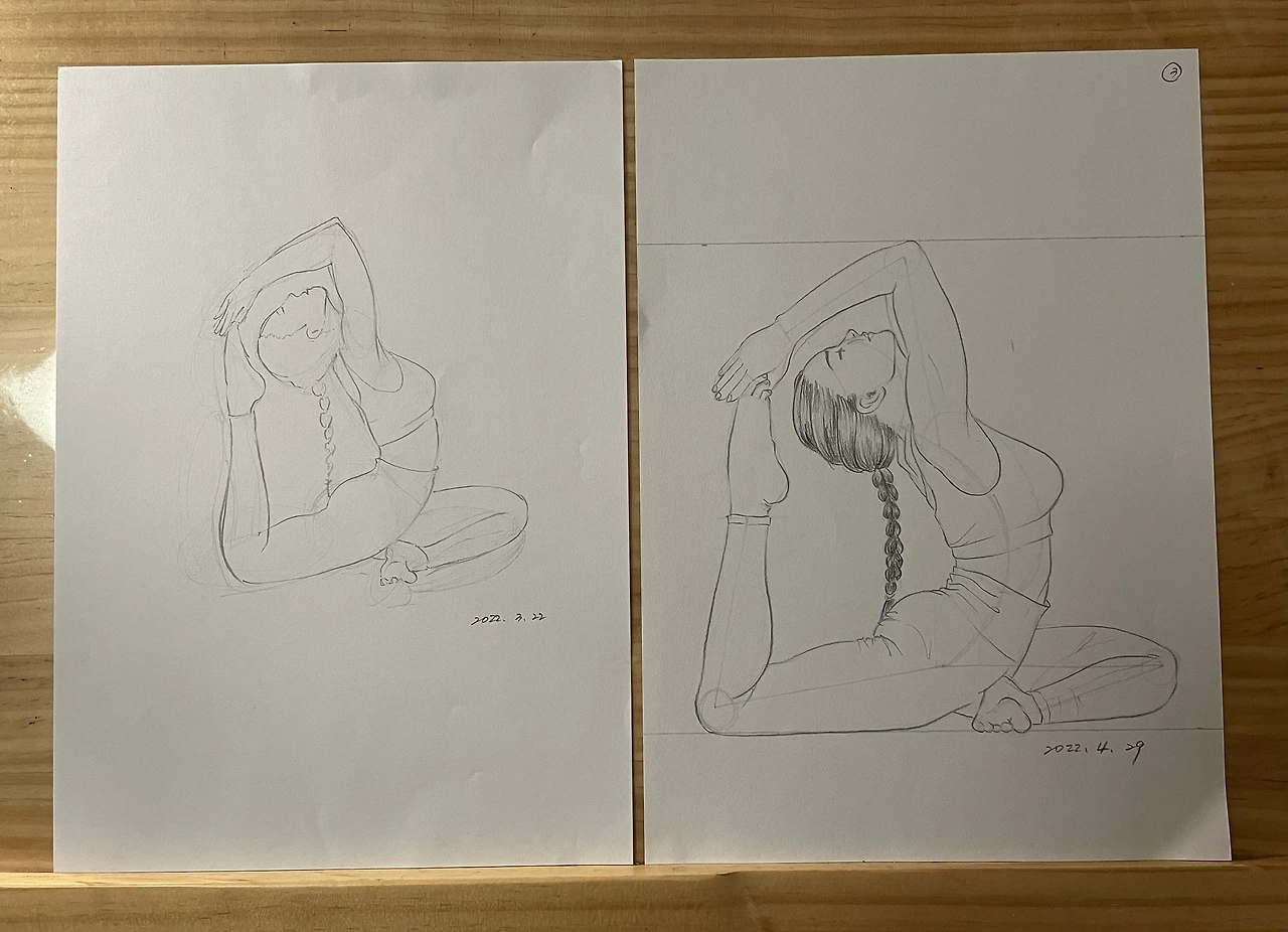 시작할 때의 그림과 마지막 그림을 비교하니 발전된 모습이 확연히 드러나 나 자신도 놀랐다. ‘선’과 ‘그림 크기’의 부족함을 느껴 이 챌린지를 시작한 건데 정작 ‘자신감’이 없었단 걸 쌤의 조언으로 알게 되었다. 큰 사이즈의 텅 빈 스케치북을 마주할 때 들었던 위축감이 어느 정도 감소된 게 큰 수확이다.