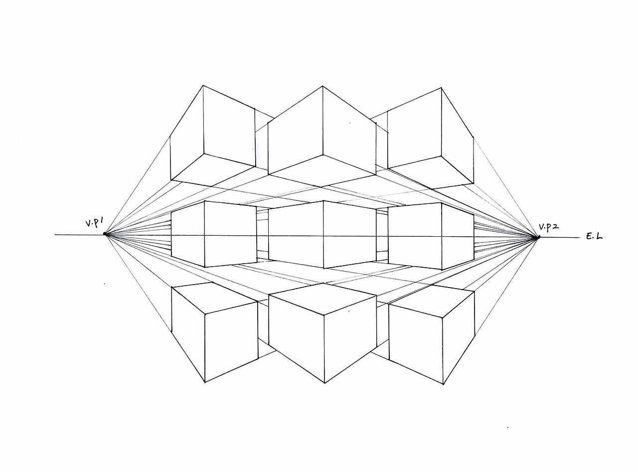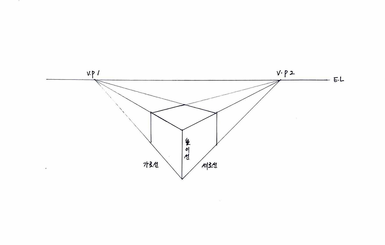 모서리를 중심에 두고 볼 때 왼쪽 면은 왼쪽 소실점으로, 오른쪽 면은 오른쪽 소실점으로 모여짐을 알 수 있지요.