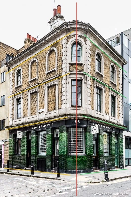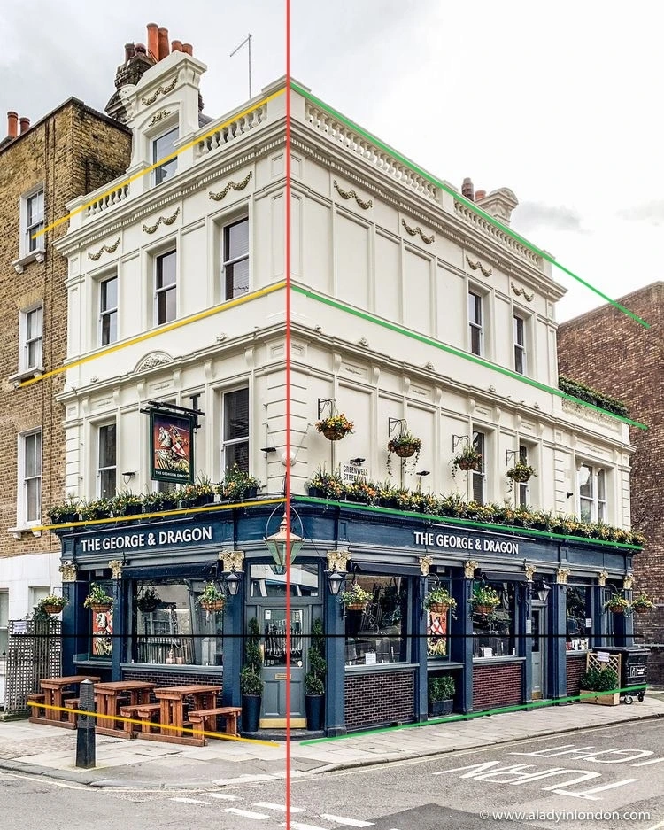 다음 건물 풍경에서도 눈높이와 소실점 2개를 찾아보세요.