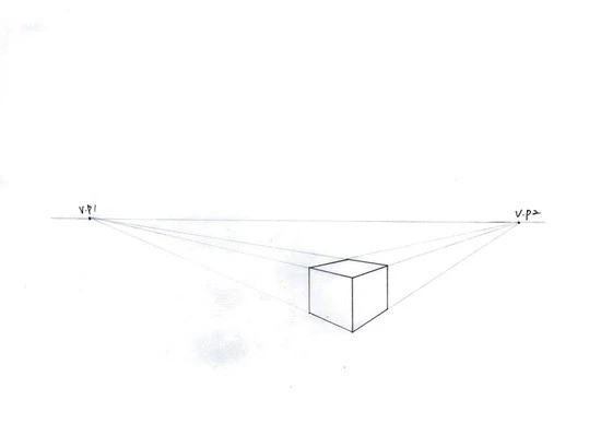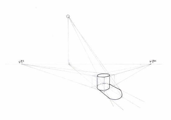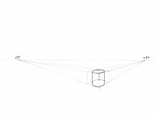 마찬가지로 육면체를 2점 투시로 그린 후 원기둥을 그려요.